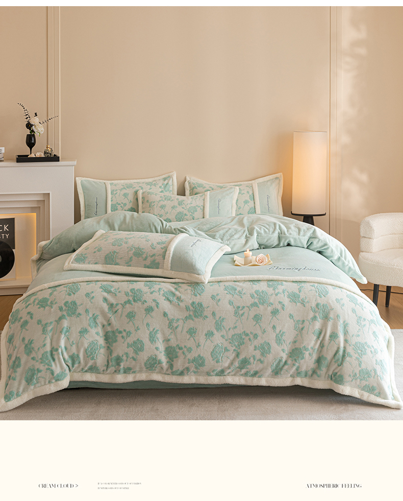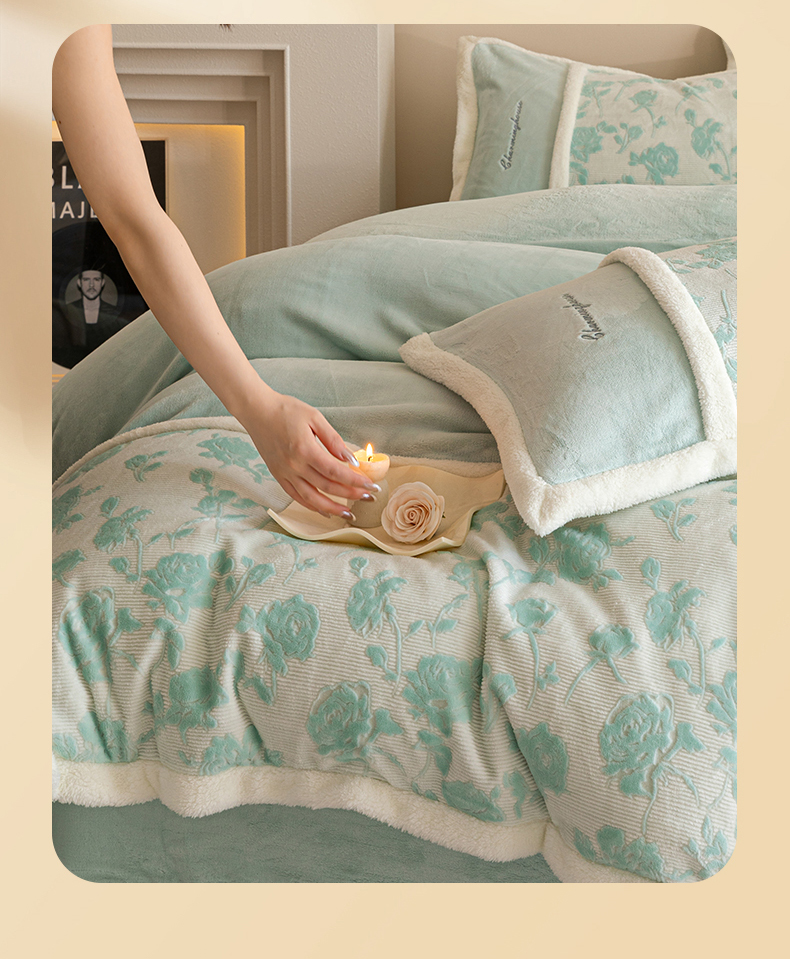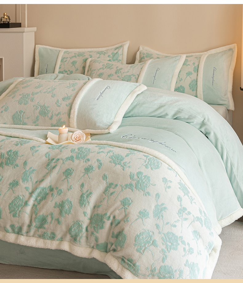 遇见家居生活馆 2025新款高克重雕花绒拼接刺绣四件套系列-艾菲妮 玫瑰-清澈蓝