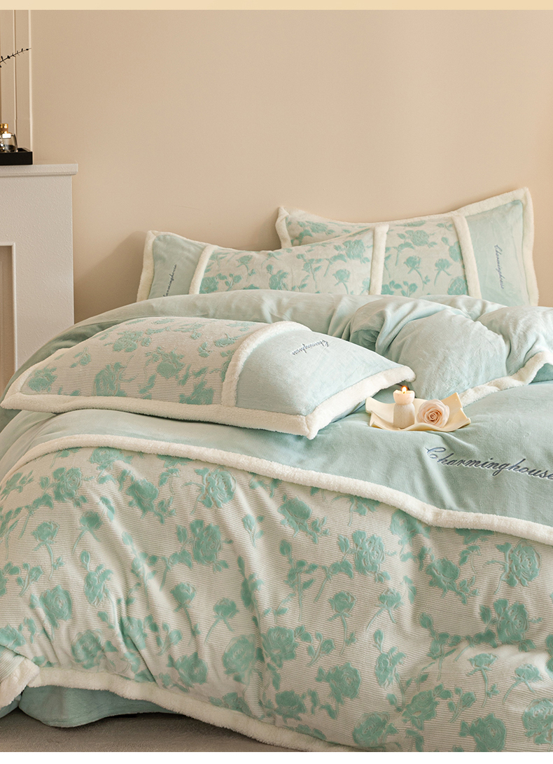 商品名称:遇见家居生活馆 2025新款高克重雕花绒拼接刺绣四件套系列-艾菲妮 玫瑰-清澈蓝