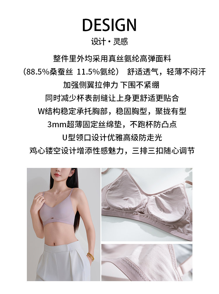 (总)蚕云阁蚕丝家居 2025新款针织真丝鸡心镂空高弹力文胸,肤色,灰粉色,浅灰色