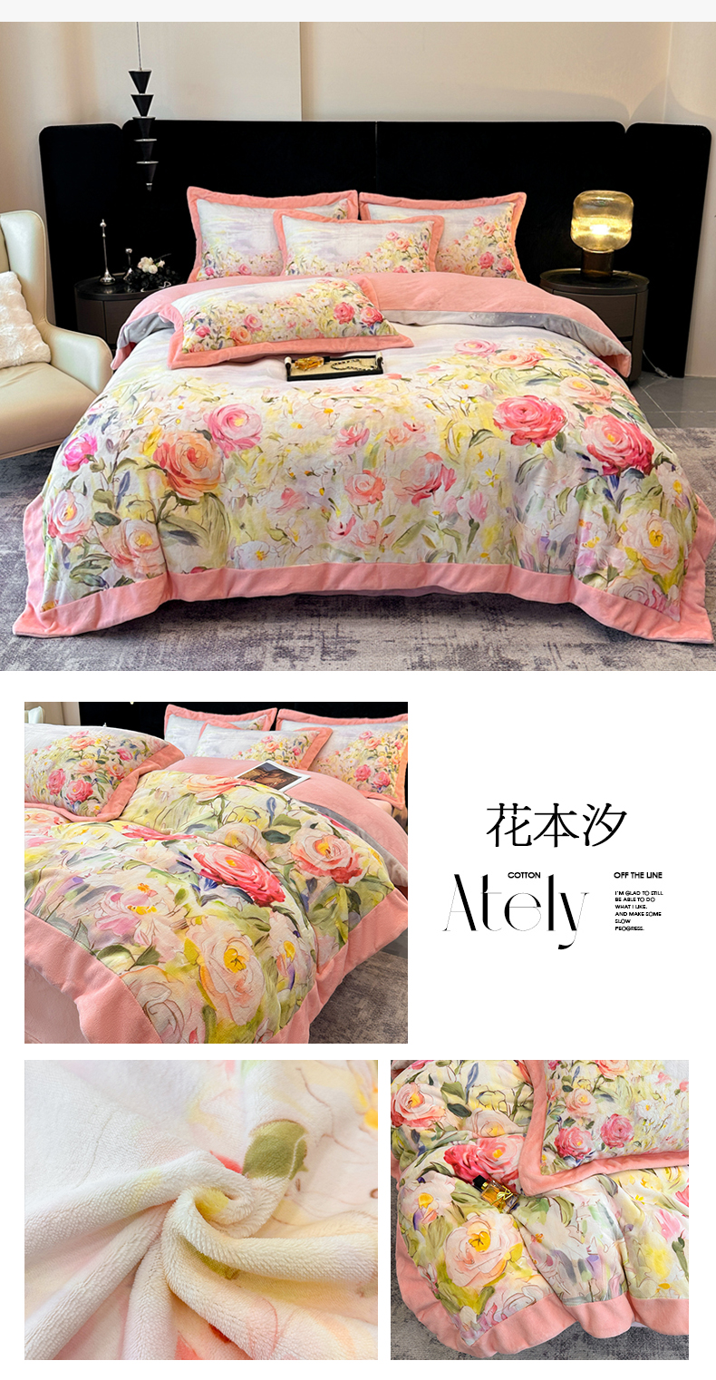 诺梵家纺 2025新款8斤加厚保暖金貂绒牛奶绒印花四件套 向阳花开粉,向阳花开粉