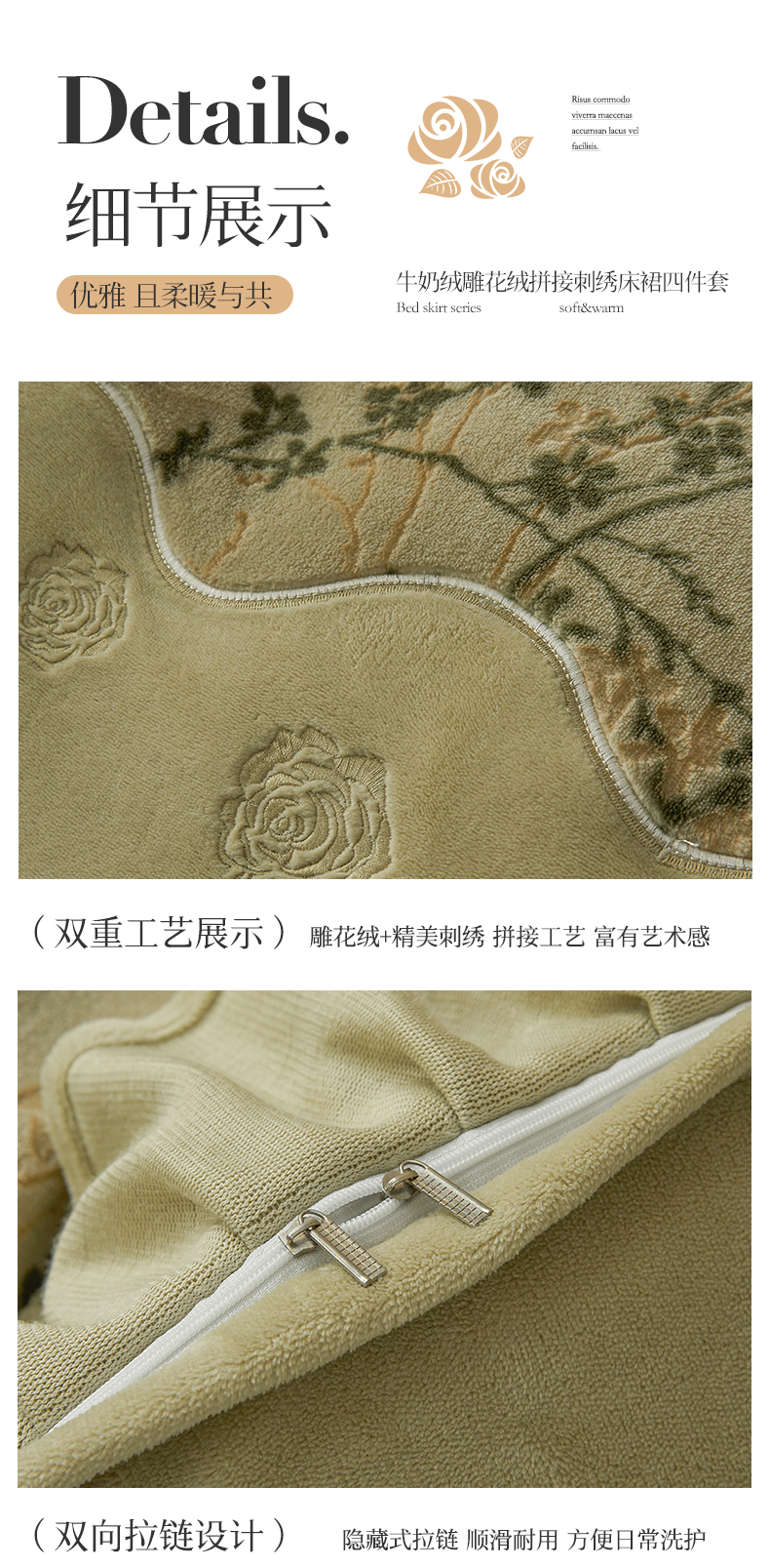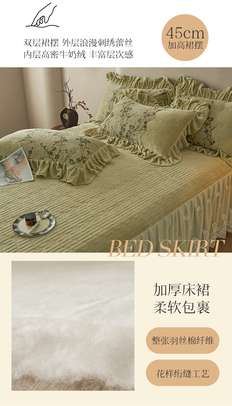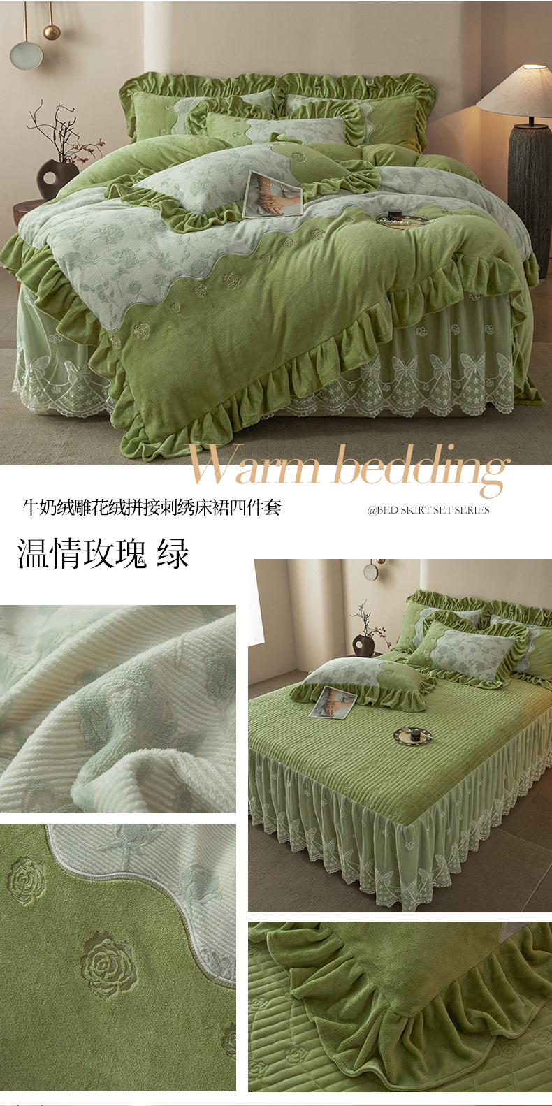 商品名称:宜凡家纺 2025新款牛奶绒雕花刺绣夹棉床裙四件套 温情玫瑰 绿