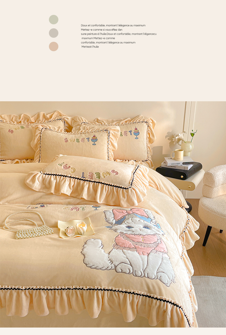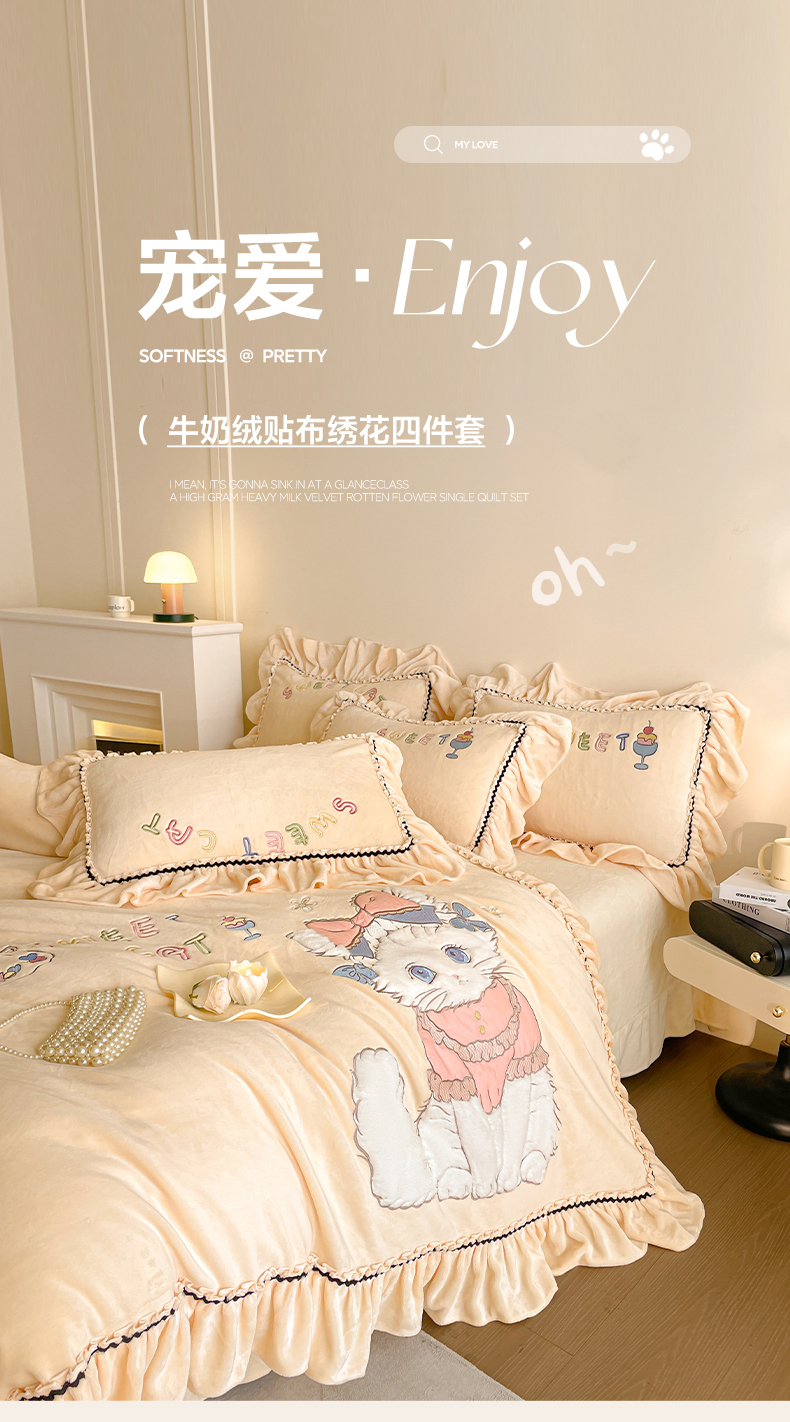 畅畅家纺 2025新款轻奢高档冬季工艺款牛奶绒毛巾绣床单床笠四件套 蜜语-浅米黄
