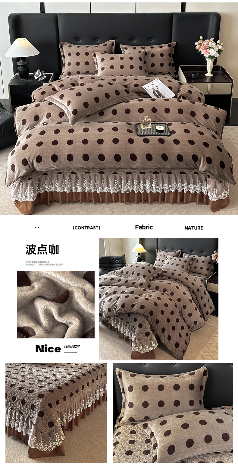 商品名称:栩裕纺织 2025新款加厚牛奶绒床盖四件套 波点咖