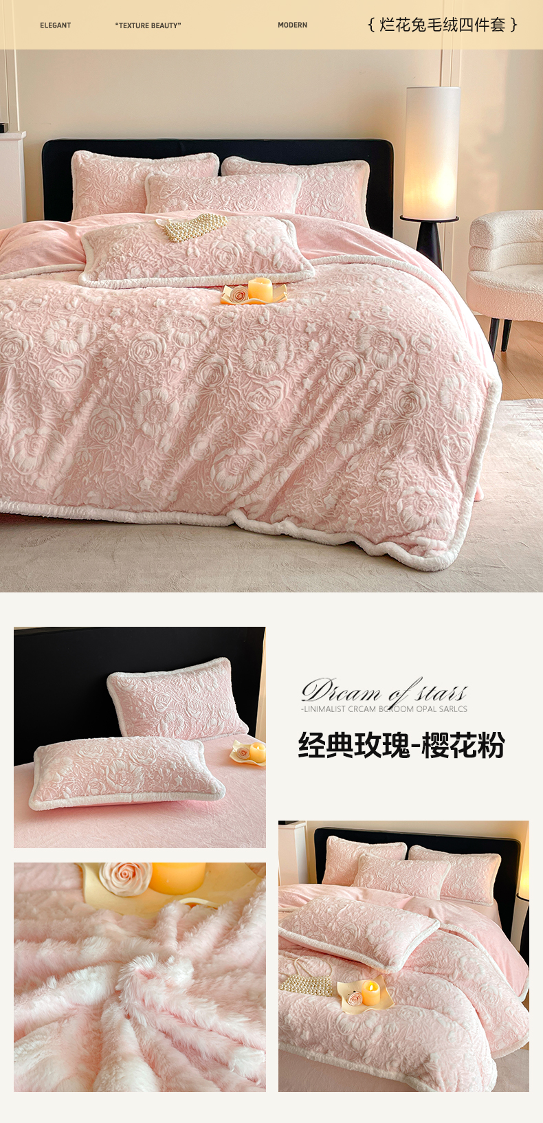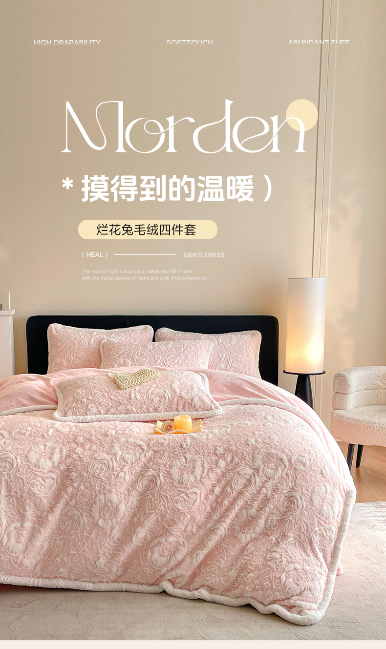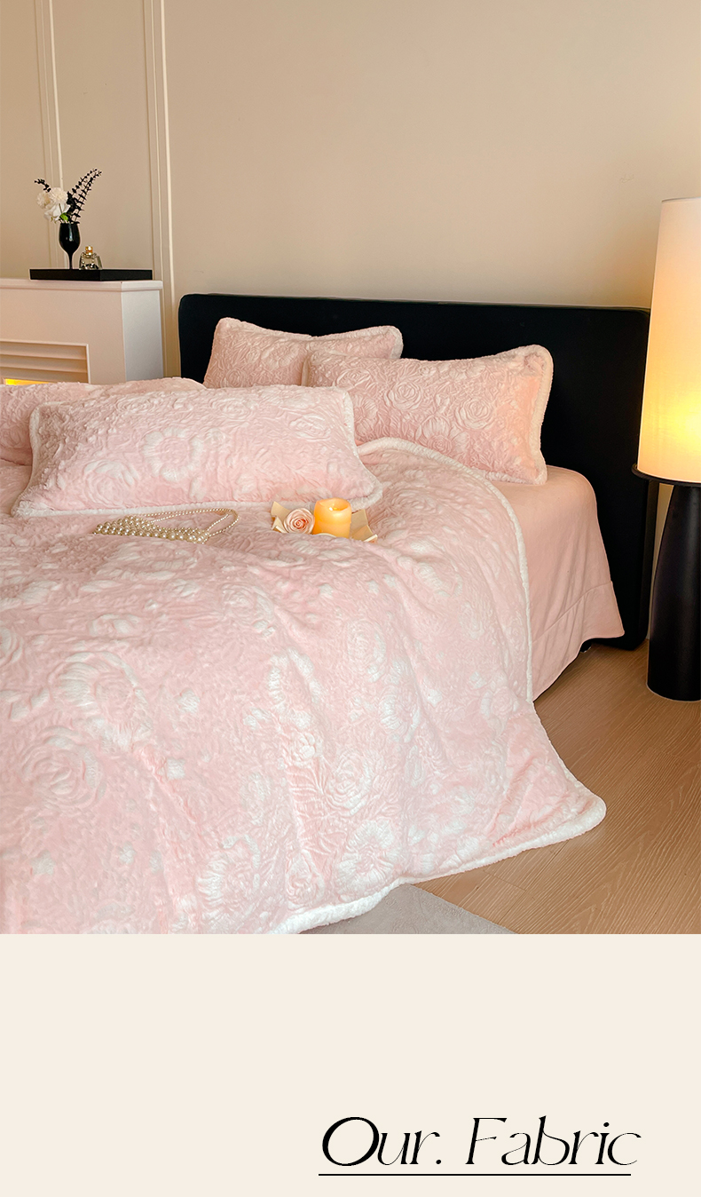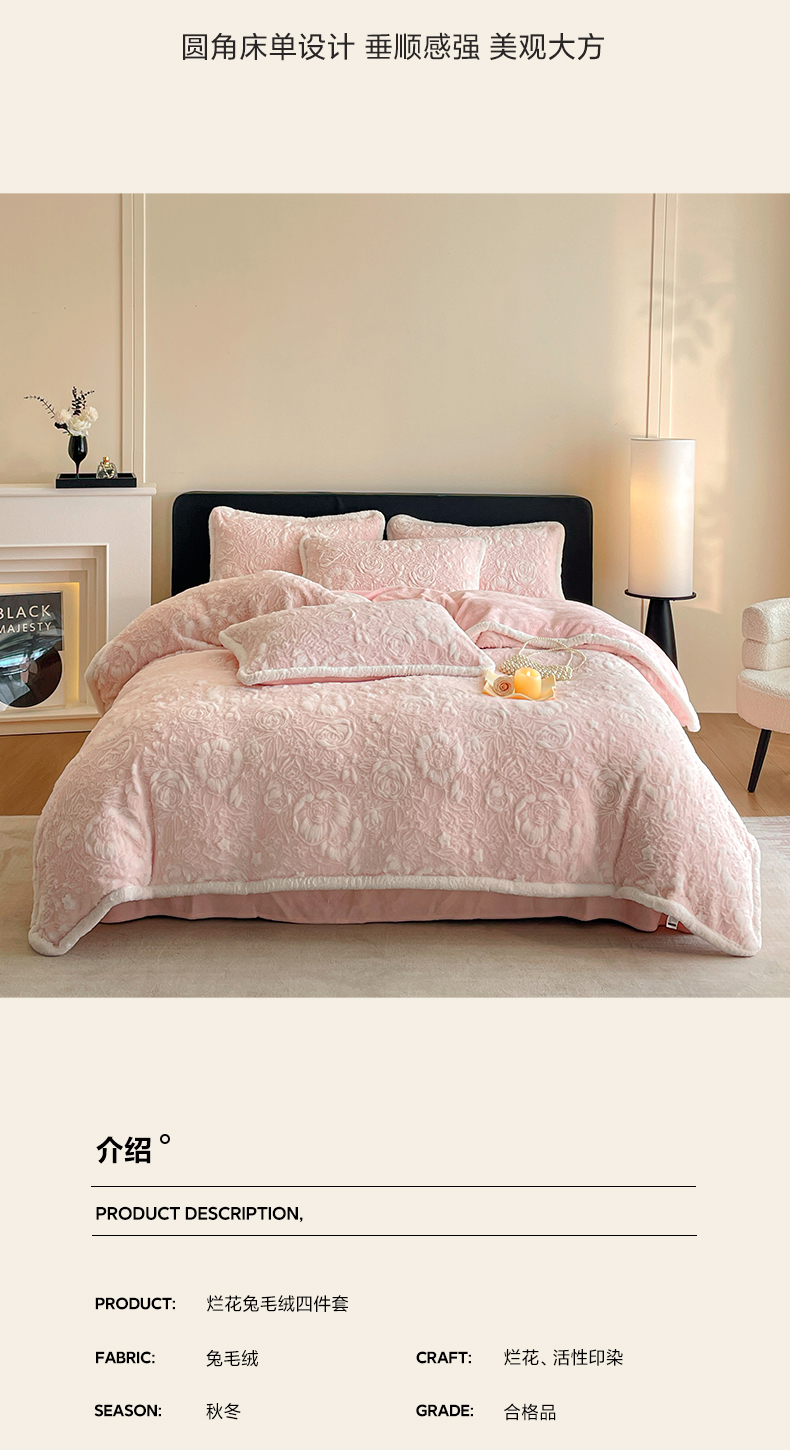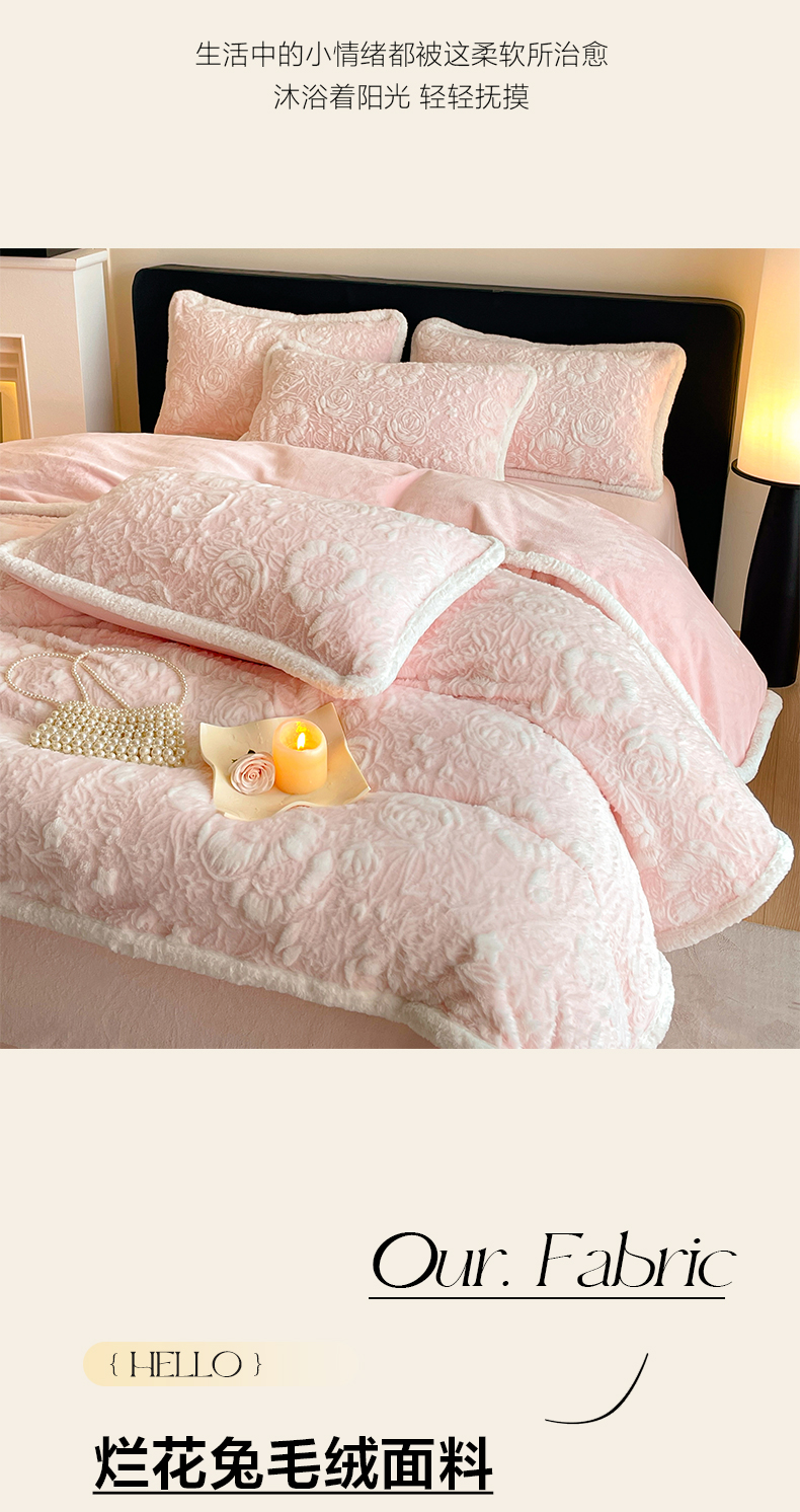 商品名称:民新家纺 2025新款立体烂花兔毛包边款四件套 经典玫瑰-樱花粉