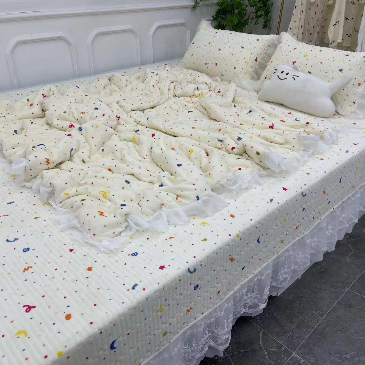 禧瑞谷 2025新款双层花边纯棉床盖雪纺蕾丝款纯棉床盖四件套 彩条熊,彩条熊