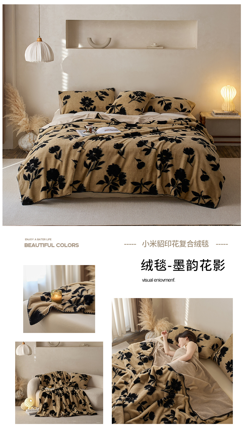 商品名称:宜代光年 2025新款小米貂印花复合绒毯毯子-系列一 绒毯-墨韵花影