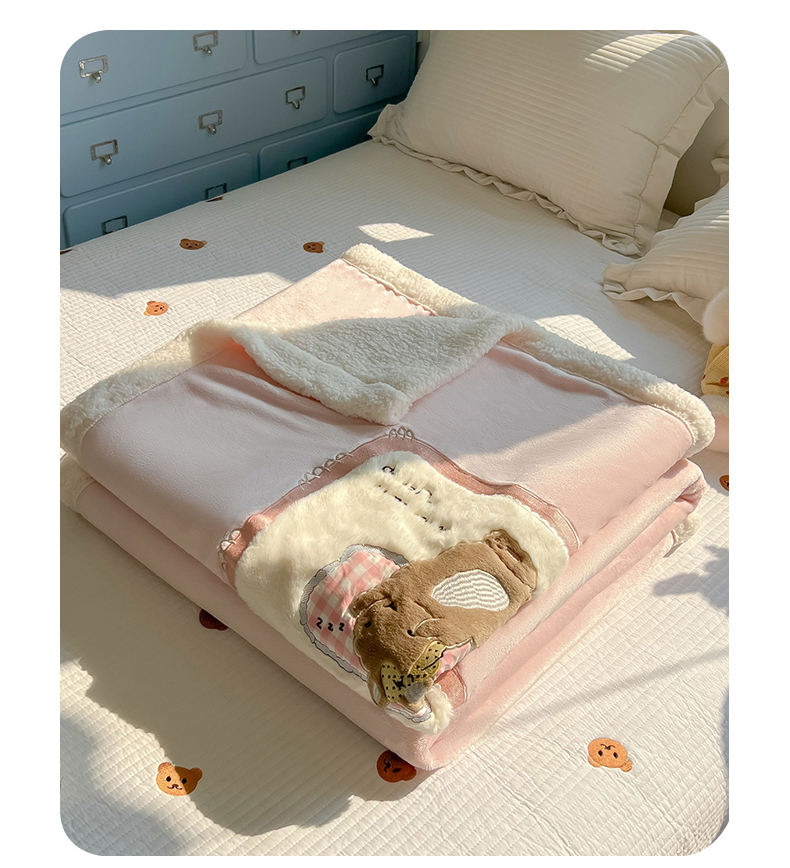 子钦家纺 2025新款秋冬加厚牛奶绒羊羔绒卡通贴布绣包边毛毯(第二波) 睡觉兔-奶油粉