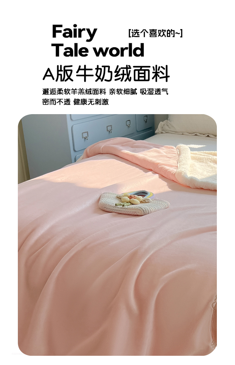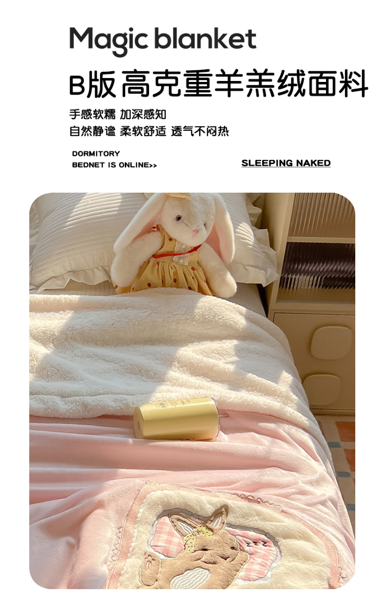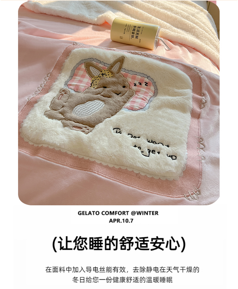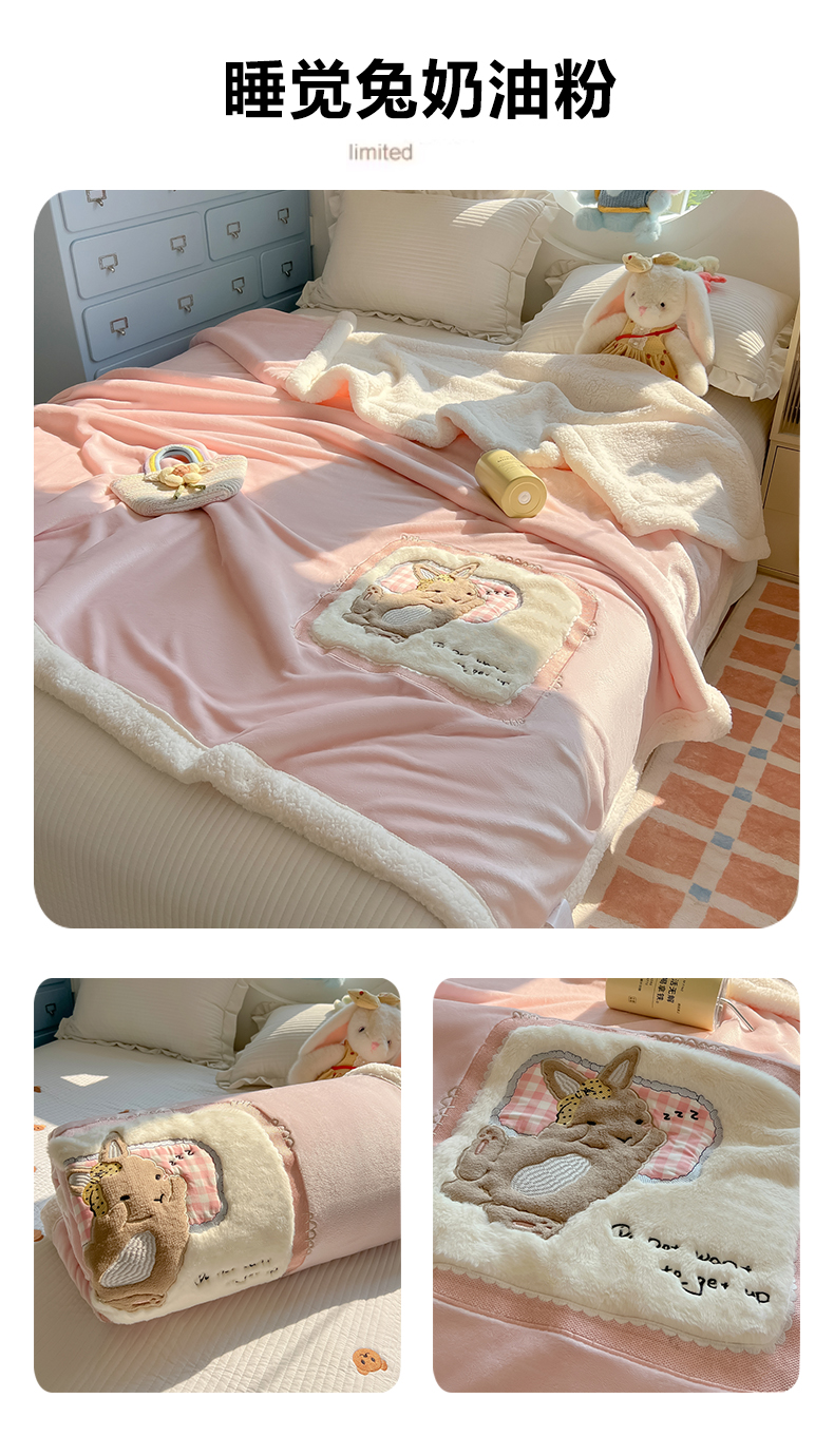 商品名称:子钦家纺 2025新款秋冬加厚牛奶绒羊羔绒卡通贴布绣包边毛毯(第二波) 睡觉兔-奶油粉