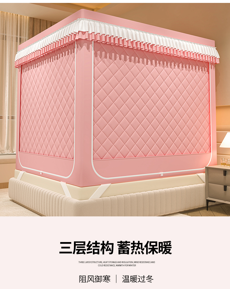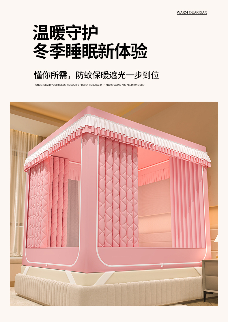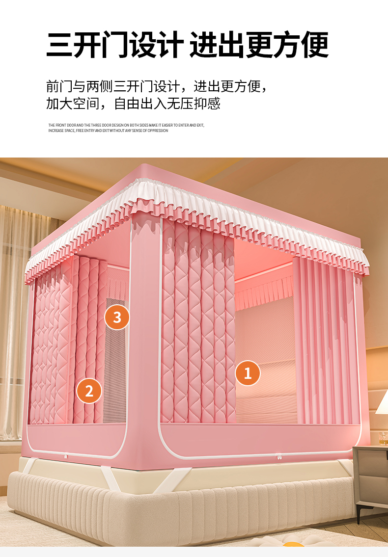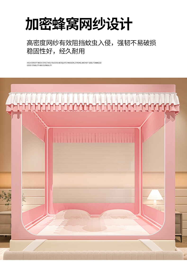 浪幔纱蚊帐 2025新款A类遮光防摔蚊帐坐床拉链全底回底纯色加厚支架 樱花粉【全底带帘款】,樱花粉【全底带帘款】