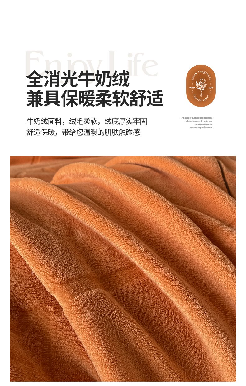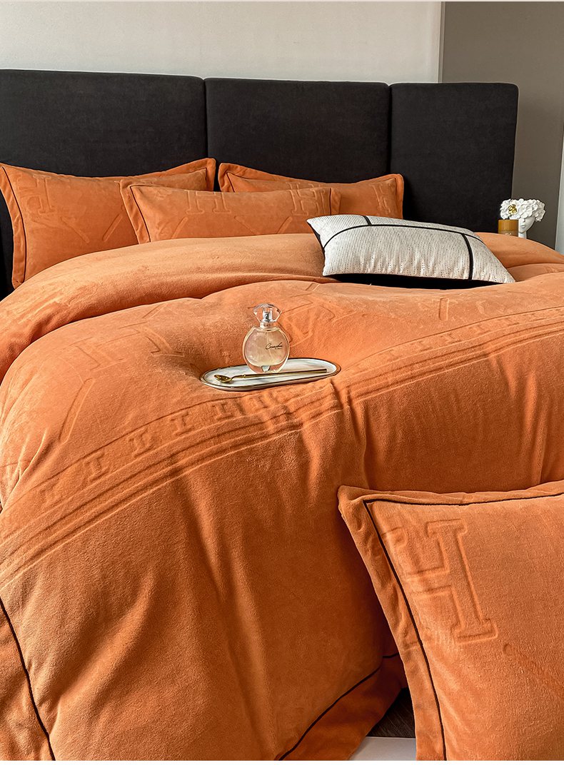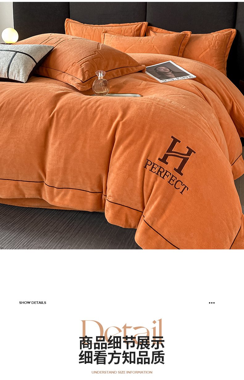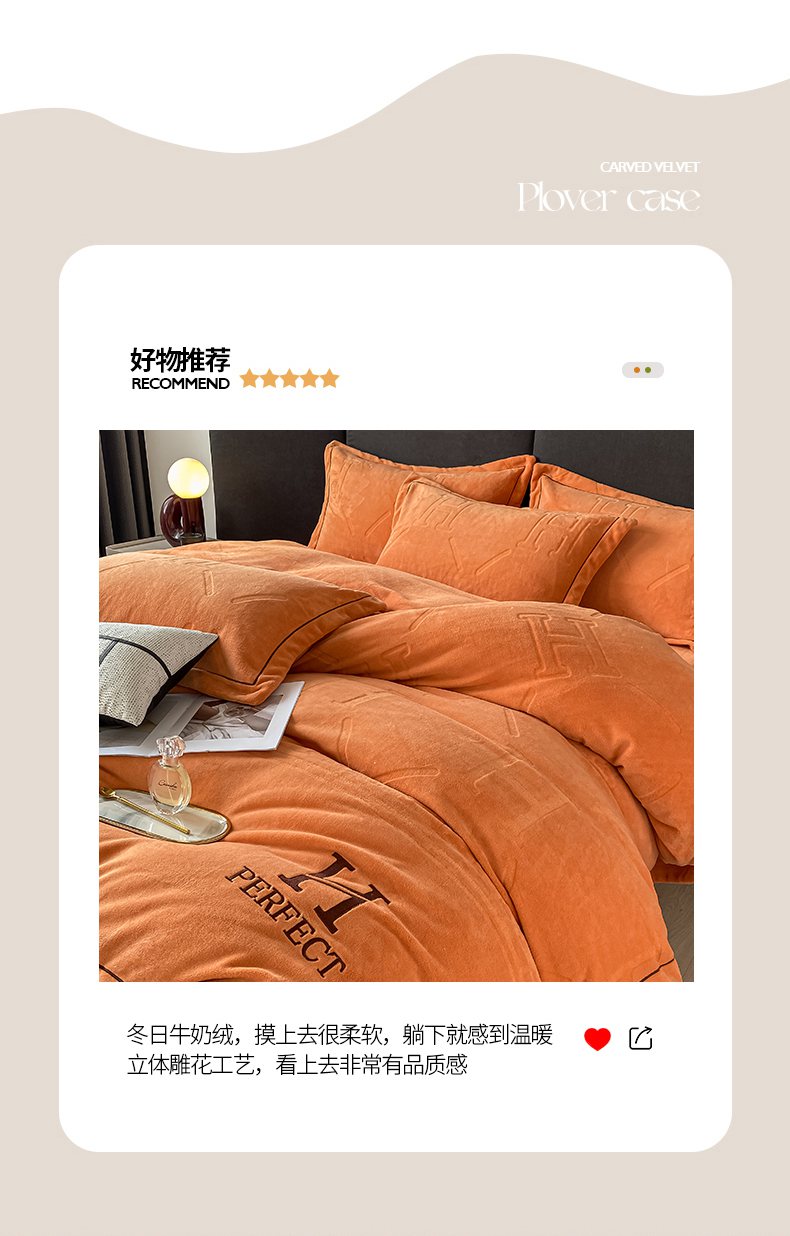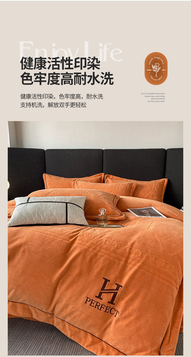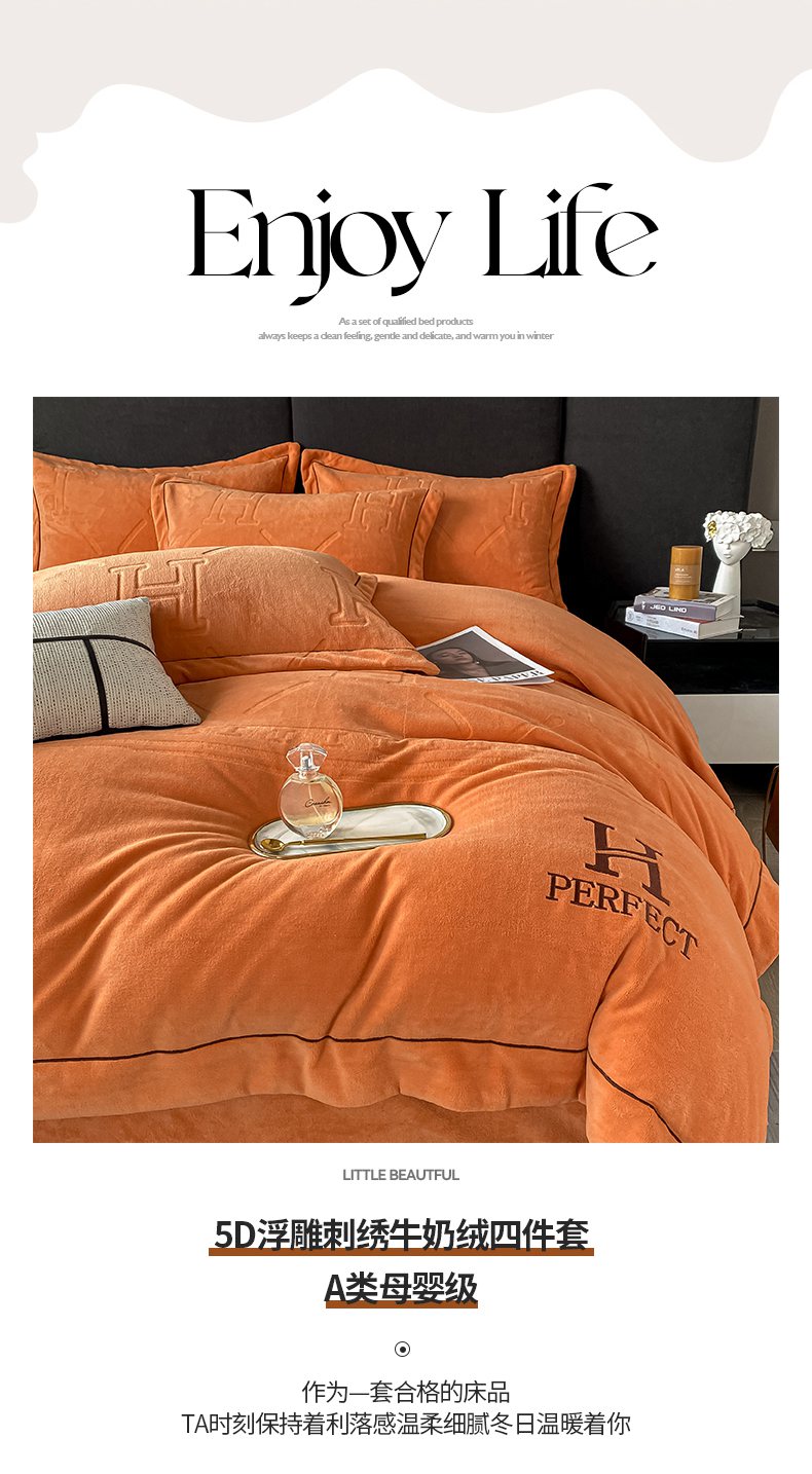 当前位置: 91家纺网 > 商品网购 > 床品套件 > 四件套 > 牛奶绒四件套 > 艾佳 2025新款A类全高克重雕花烂花刺绣牛奶绒四件套-小H系列 小H爱玛橙