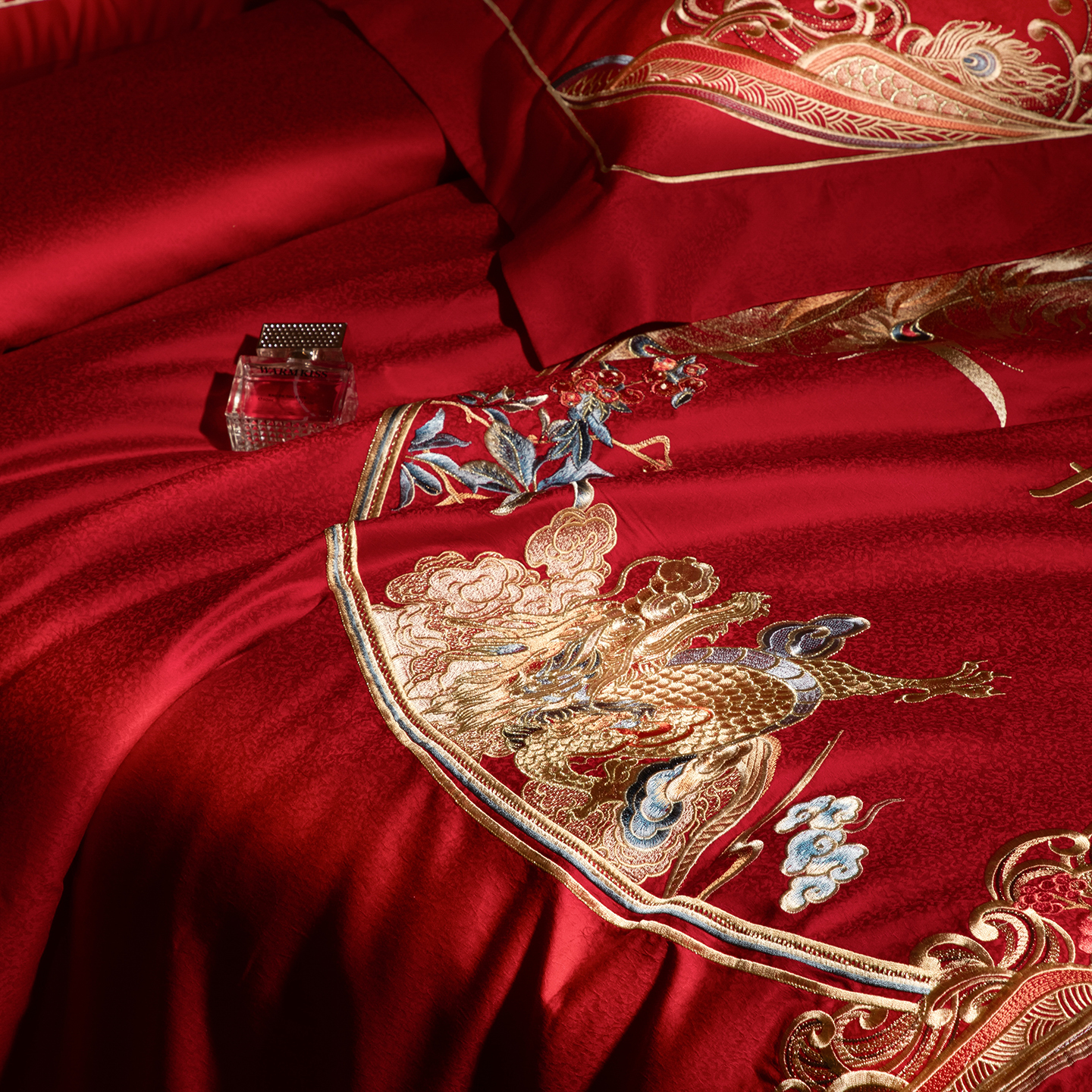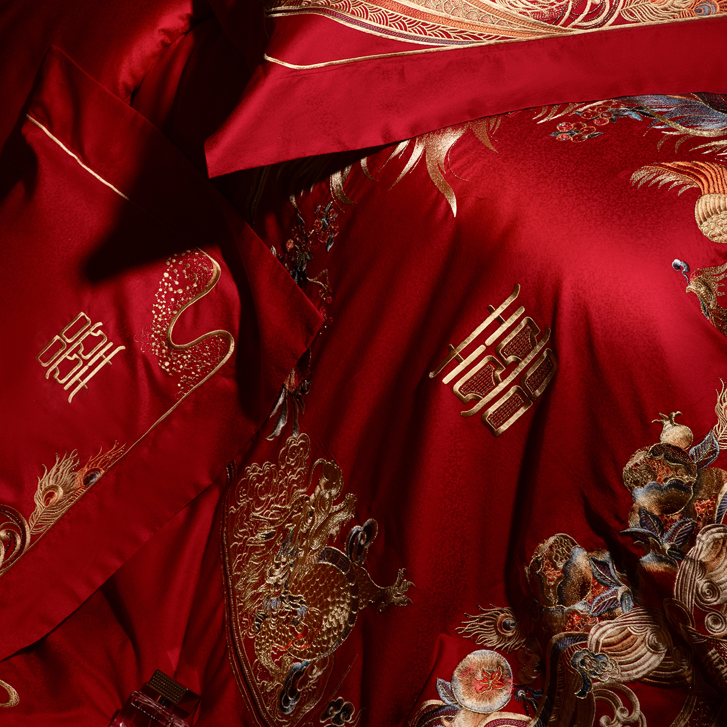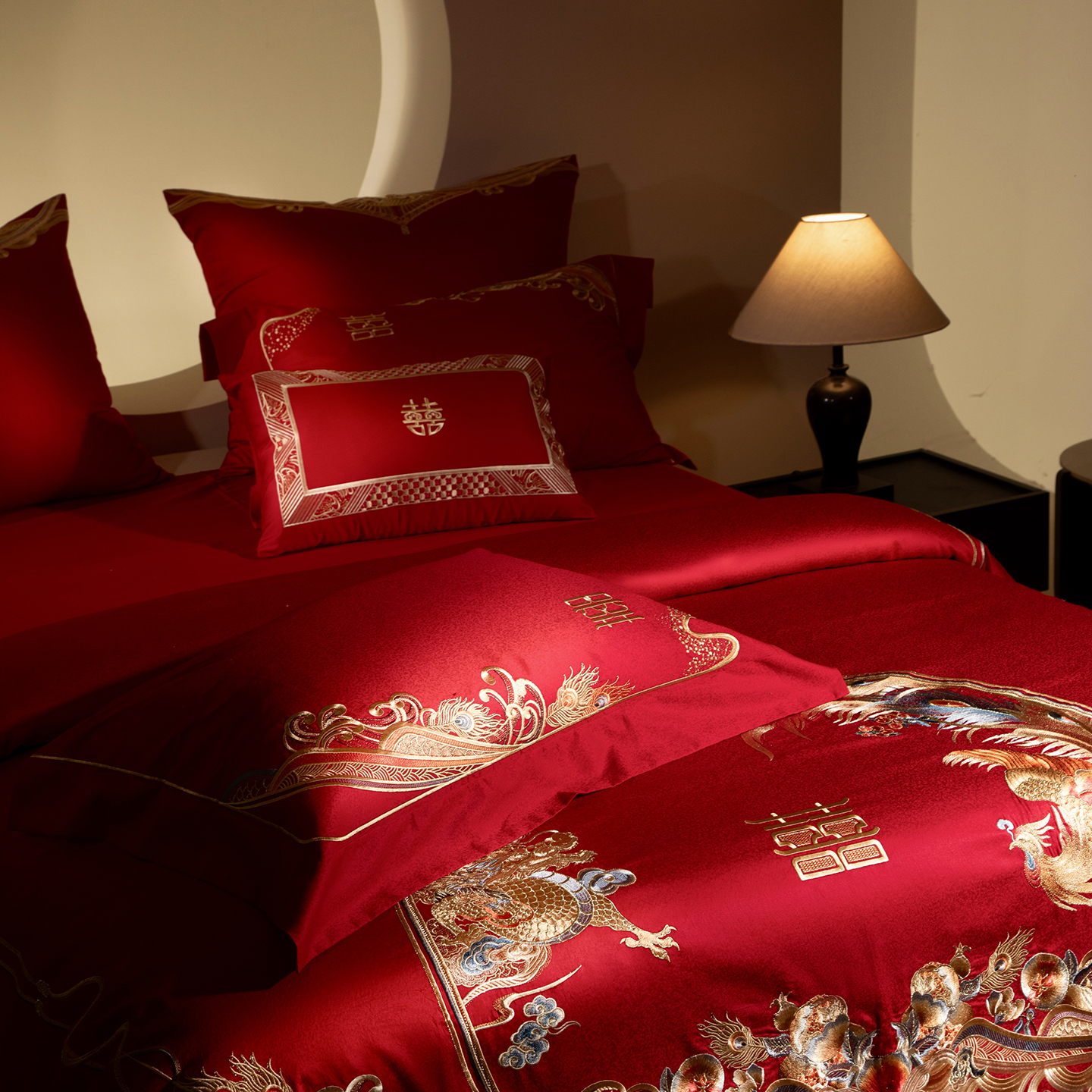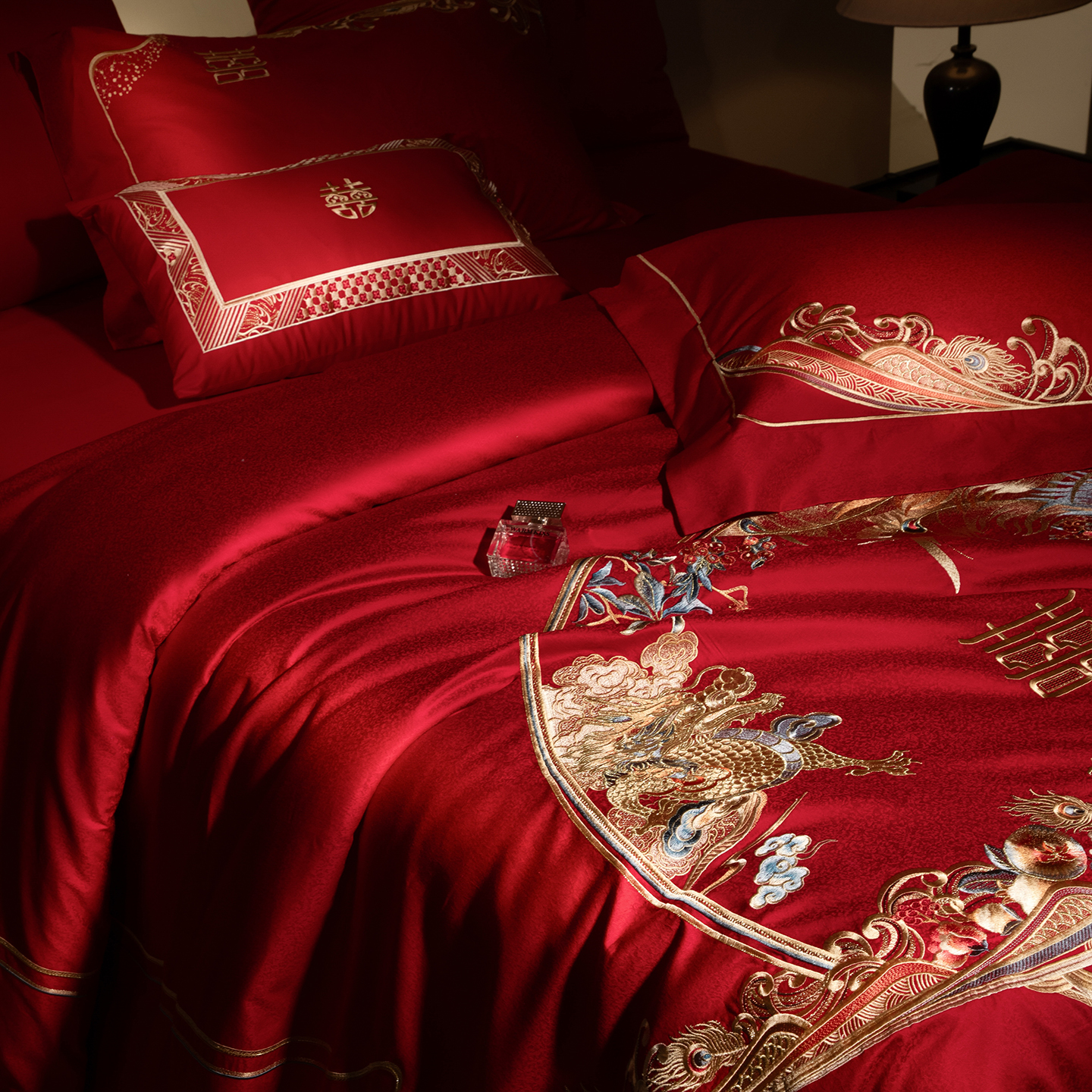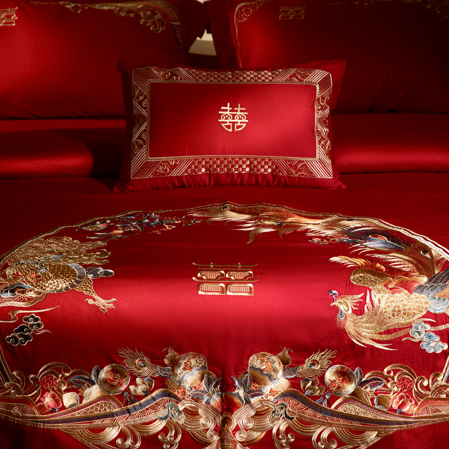 商品名称:(总)佳汐蓝家纺 2025新款100支全棉刺绣婚庆四件套-宫囍龙凤