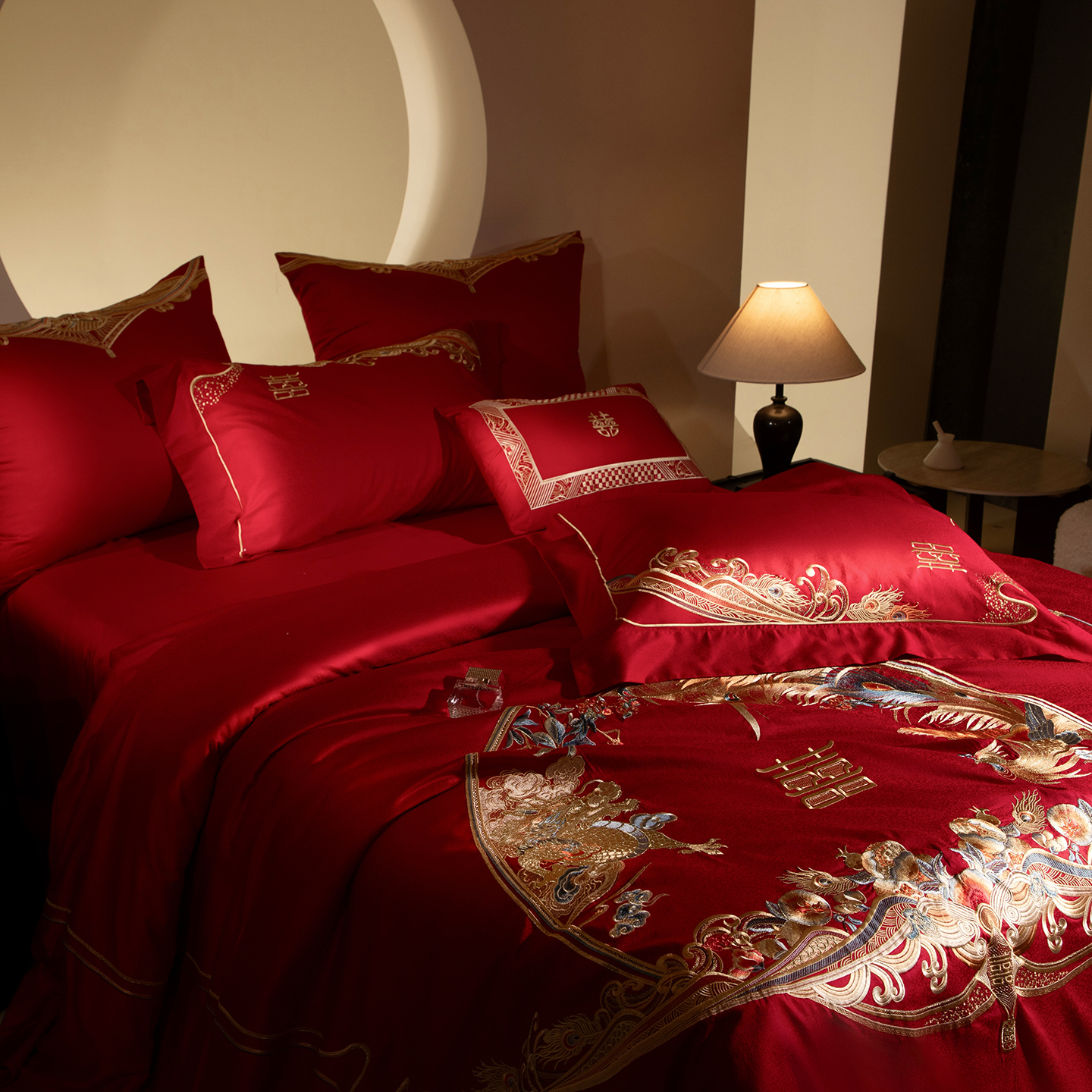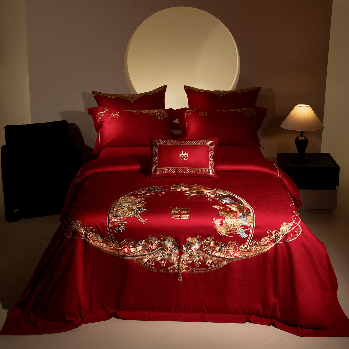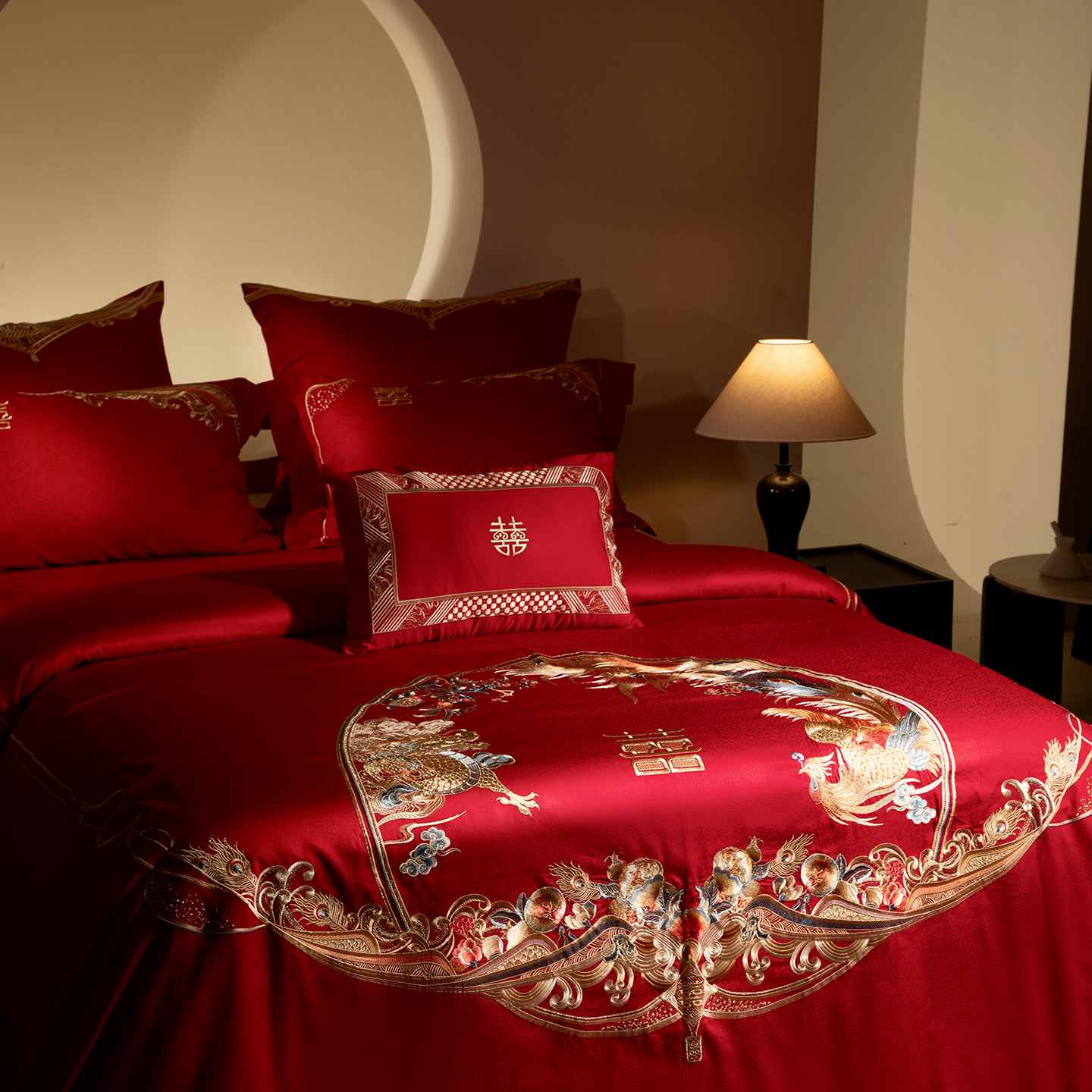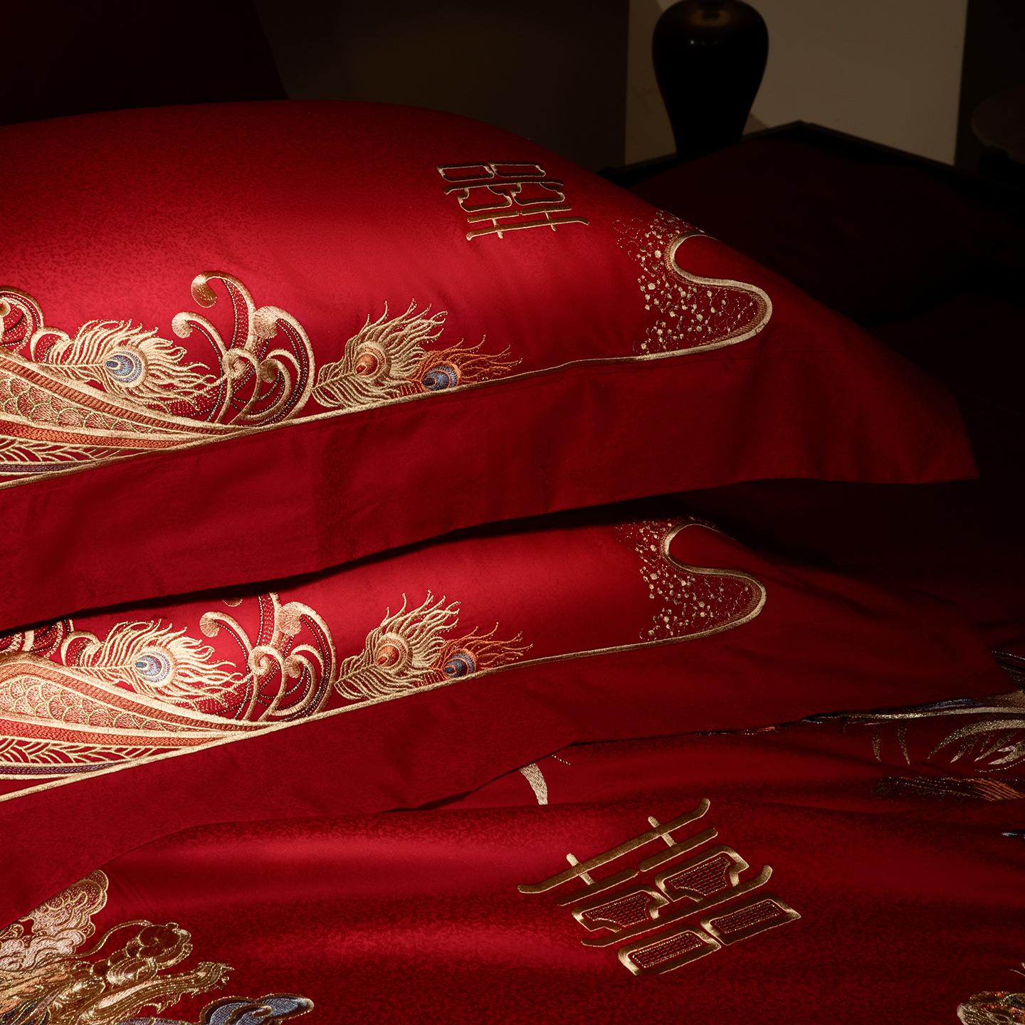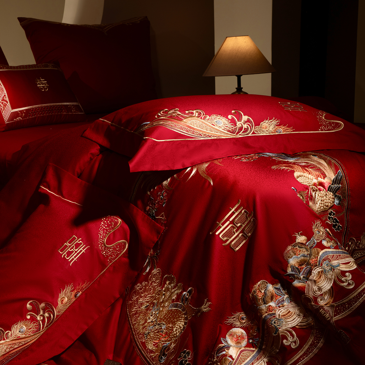 商品名称:(总)佳汐蓝家纺 2025新款100支全棉刺绣婚庆四件套-宫囍龙凤
