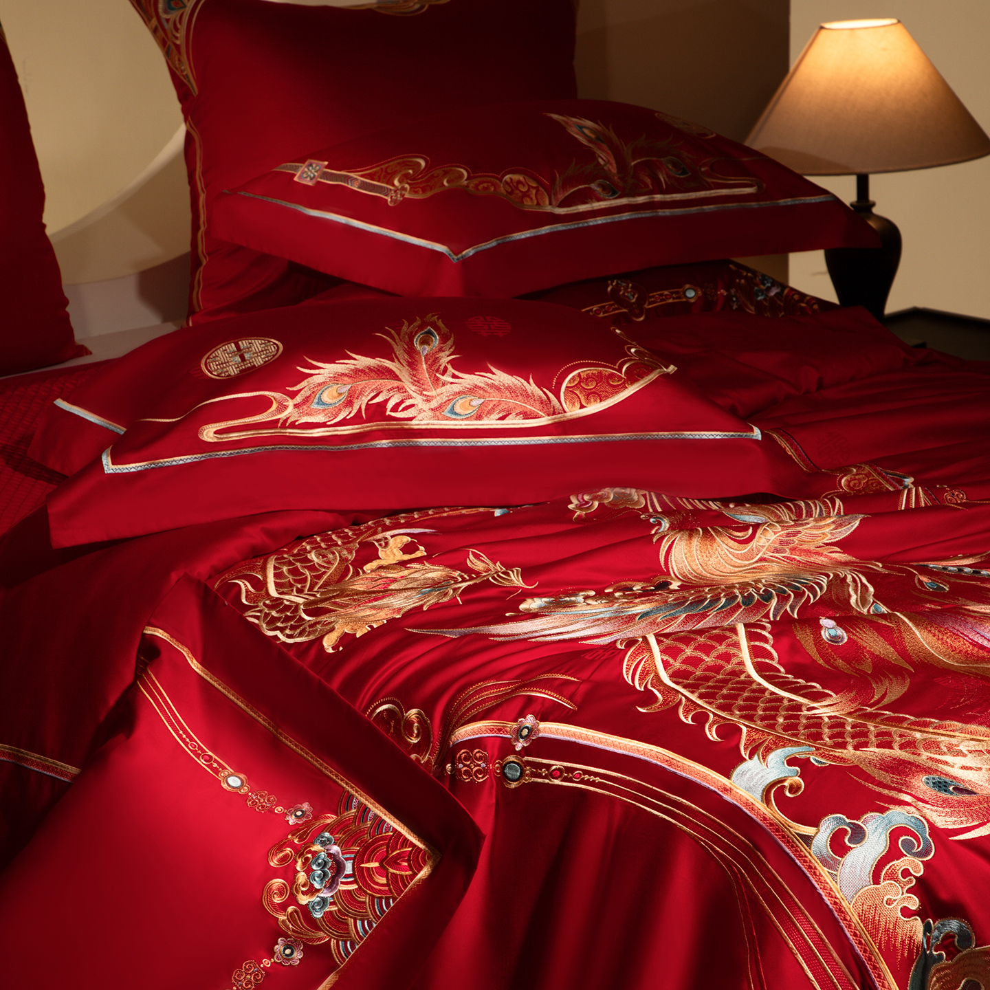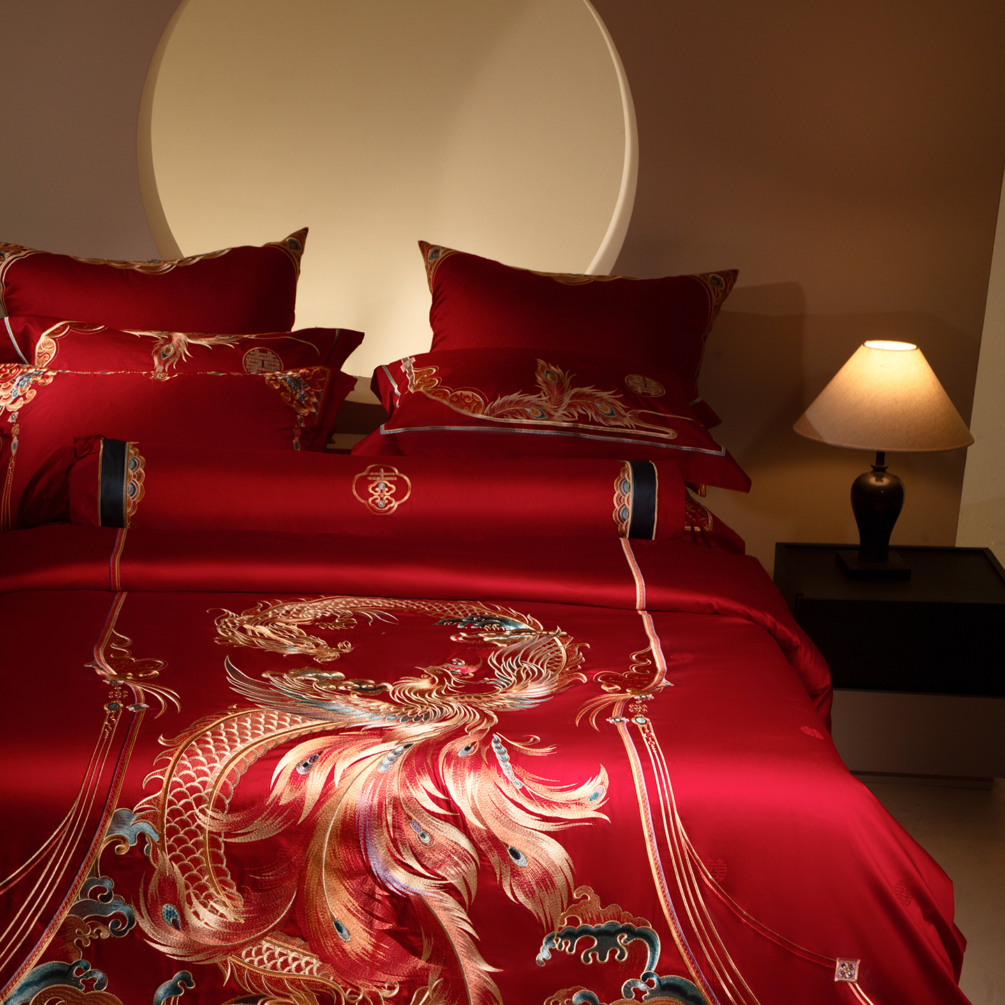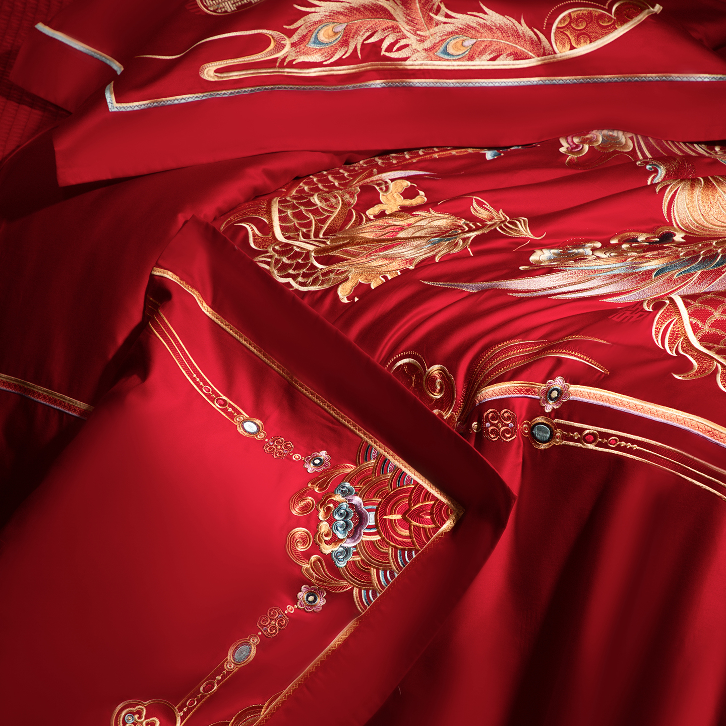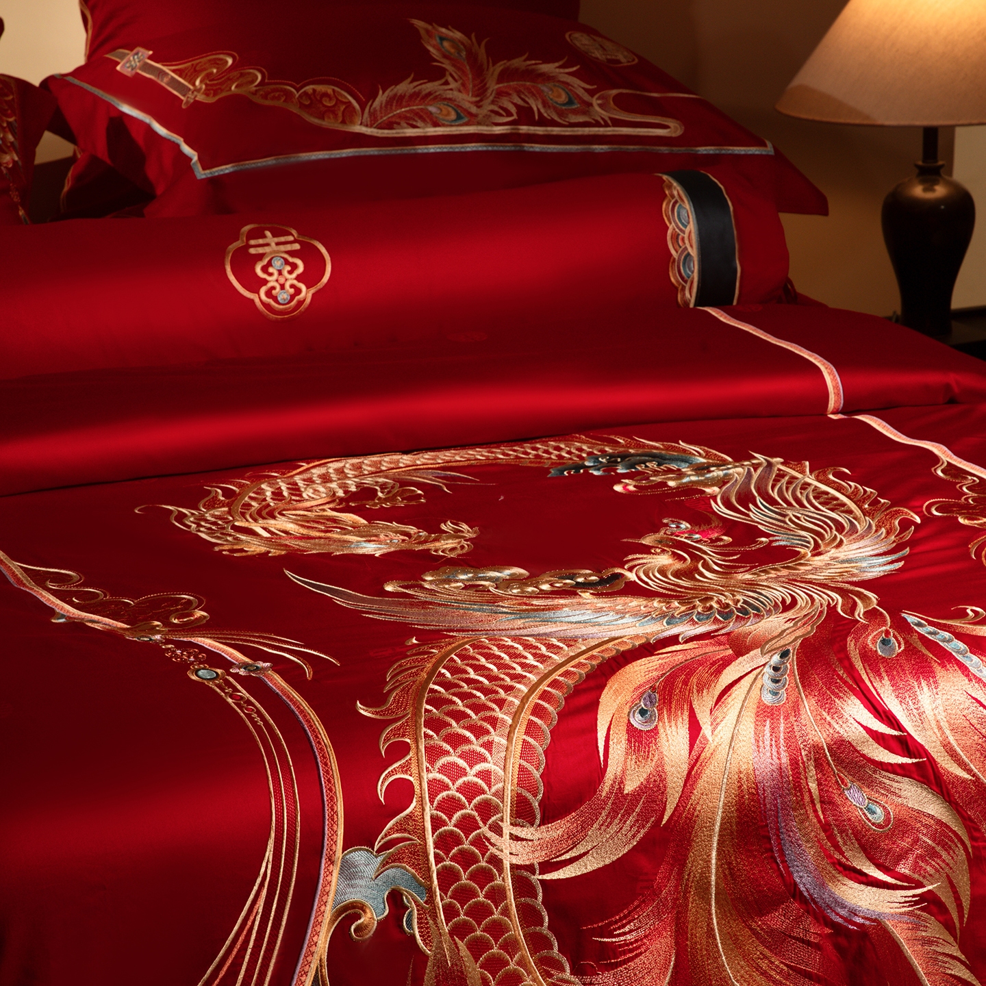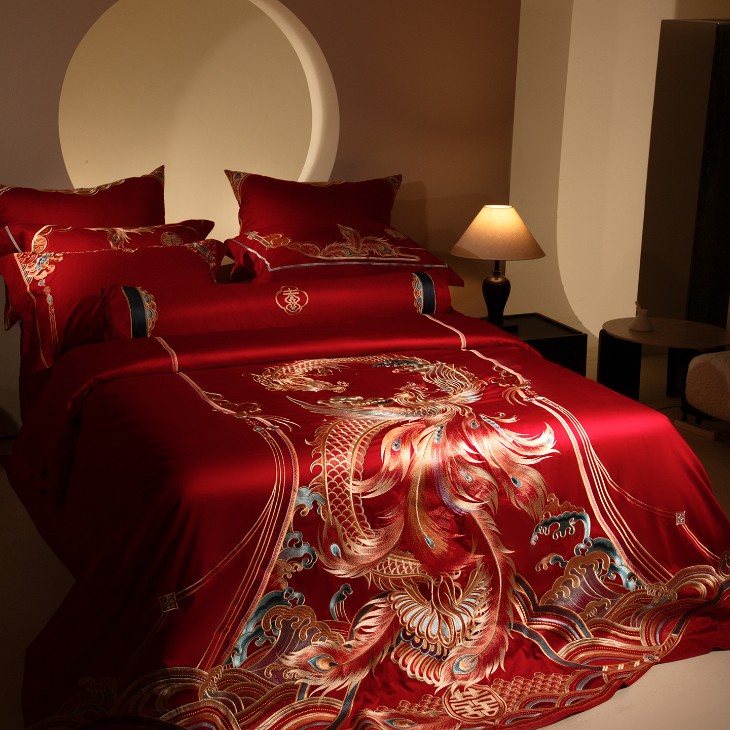 当前位置: 91家纺网 > 商品网购 > 床品套件 > 四件套 > 婚庆四件套 > (总)佳汐蓝家纺 2025新款100支贡缎提花全棉刺绣婚庆四件套-龙凤喜合