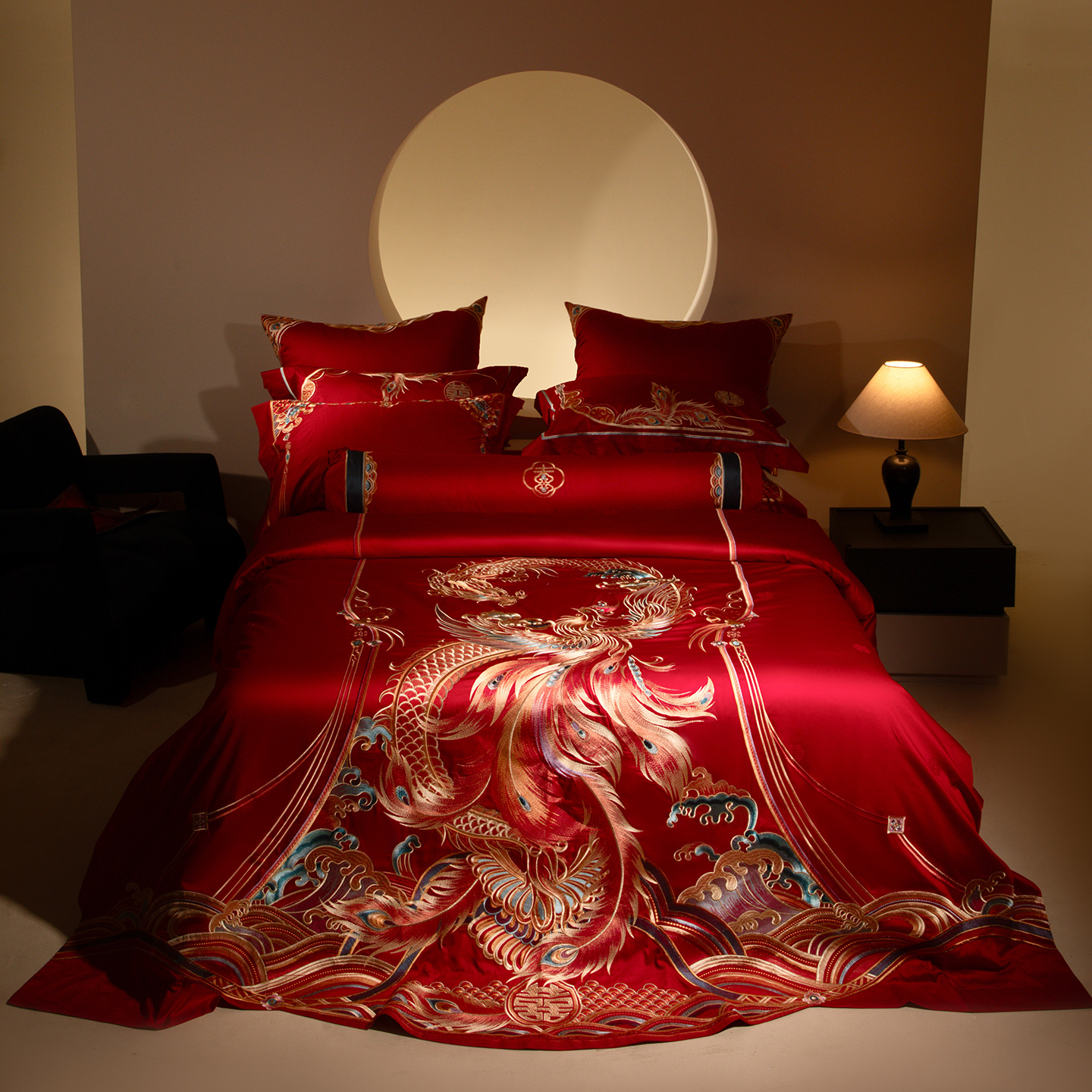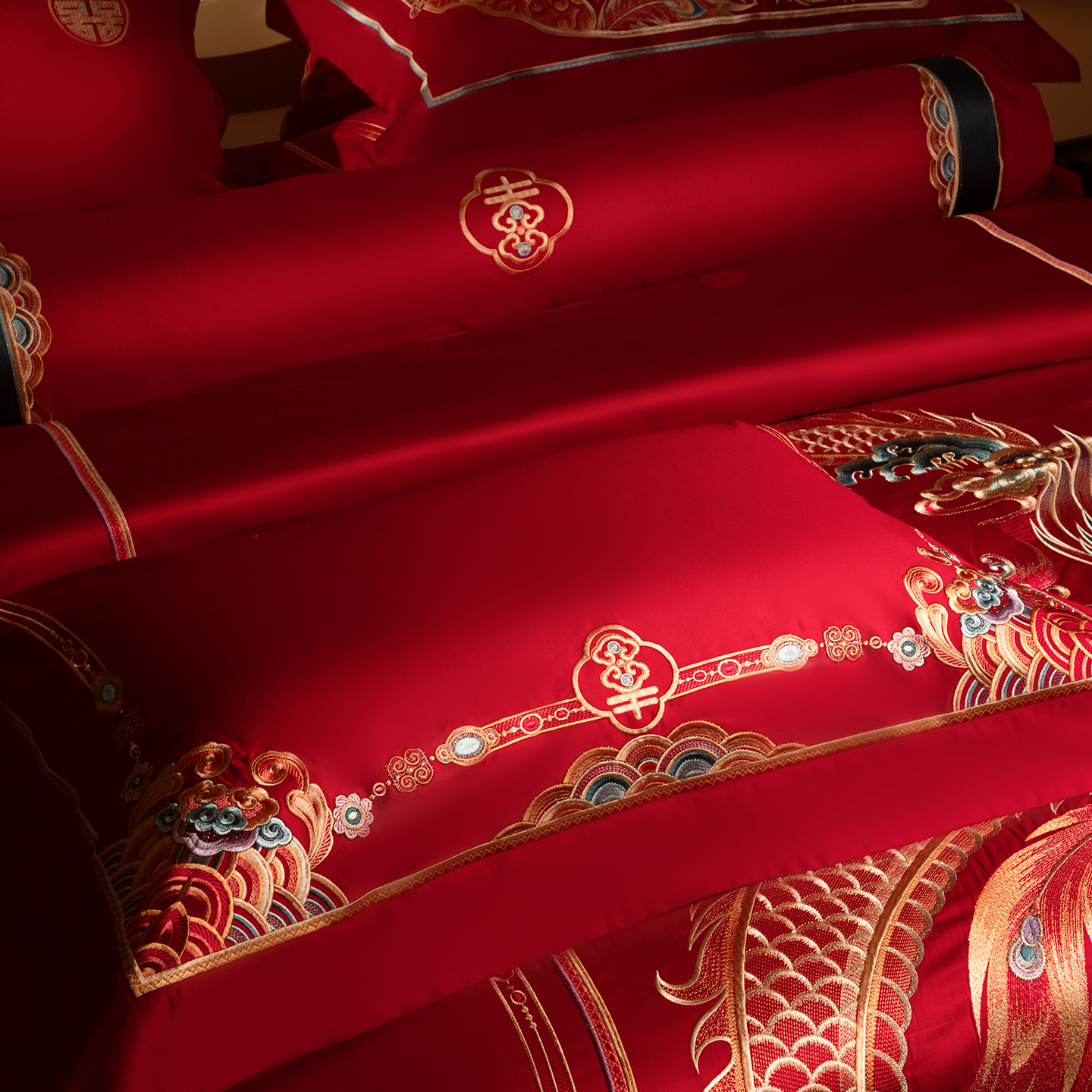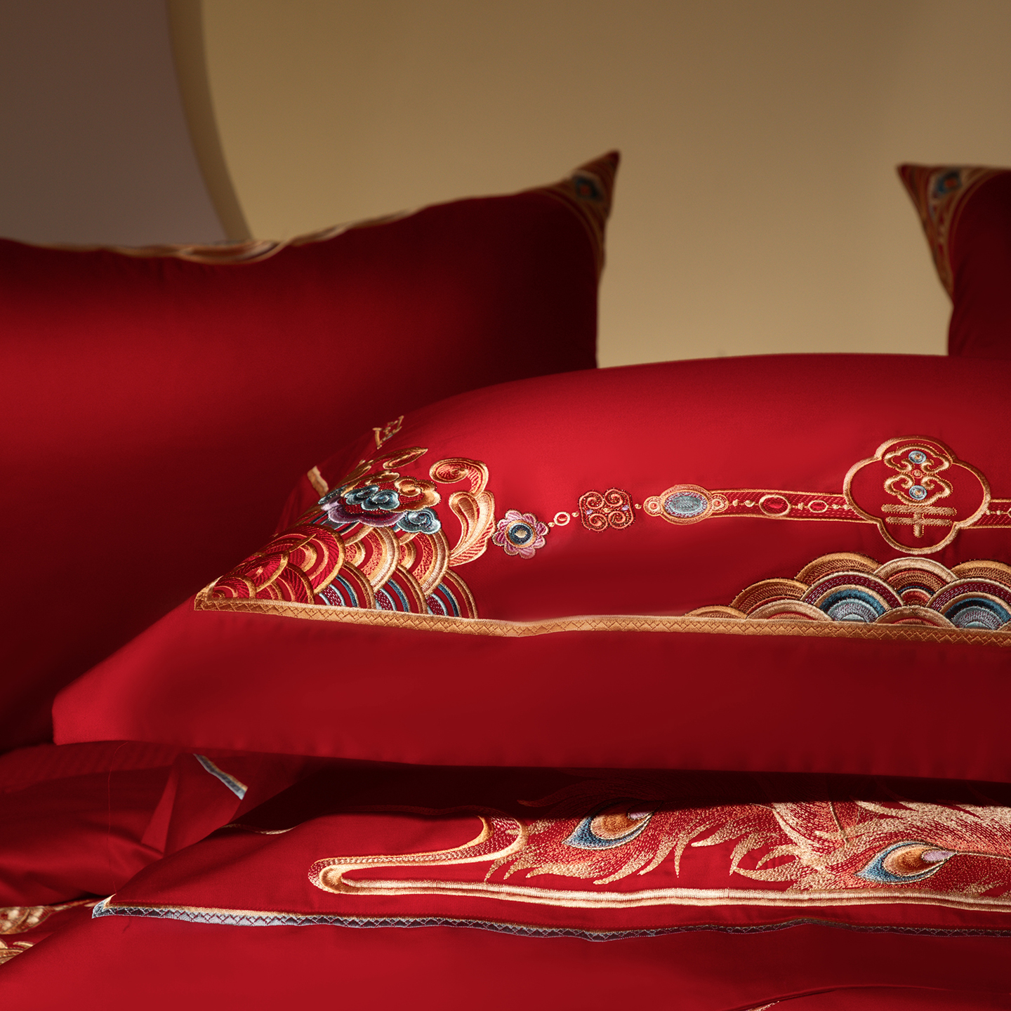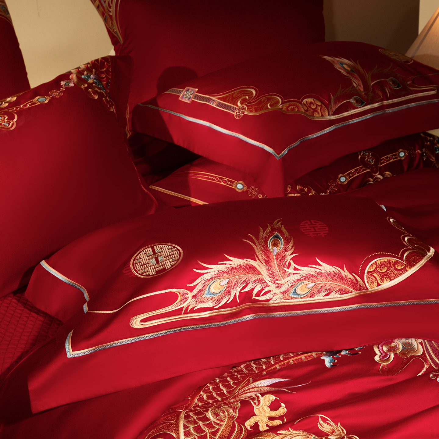 当前位置: 91家纺网 > 商品网购 > 床品套件 > 四件套 > 婚庆四件套 > (总)佳汐蓝家纺 2025新款100支贡缎提花全棉刺绣婚庆四件套-龙凤喜合
