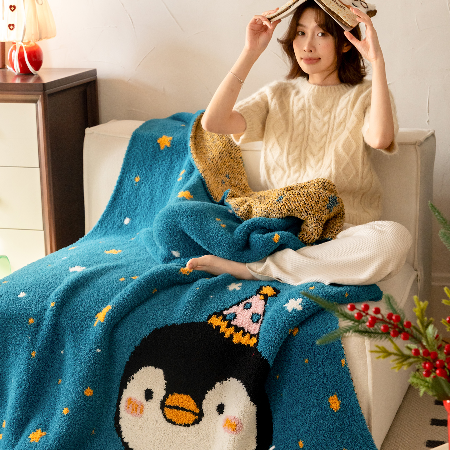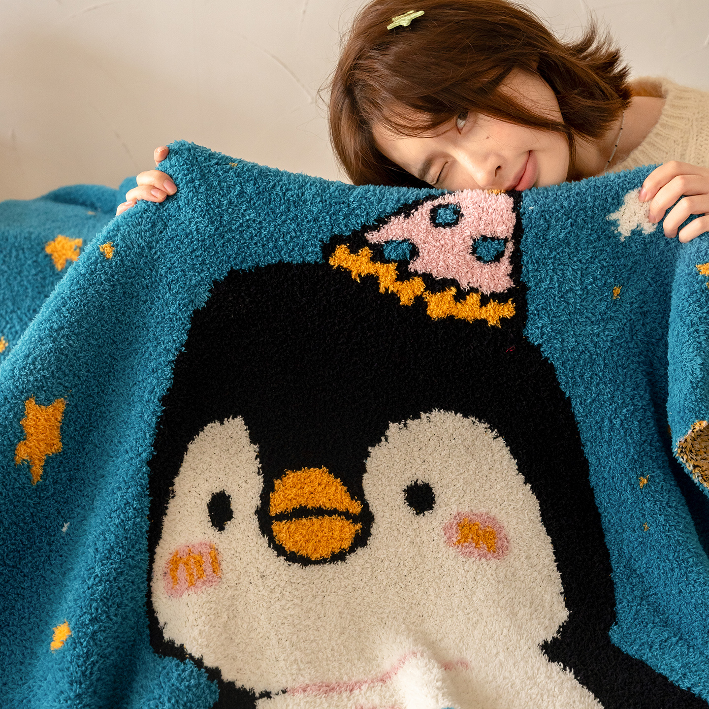 商品名称:多乐娜 2025新款原创设计半边绒毛毯盖毯沙发毯毯子 企鹅嘟嘟