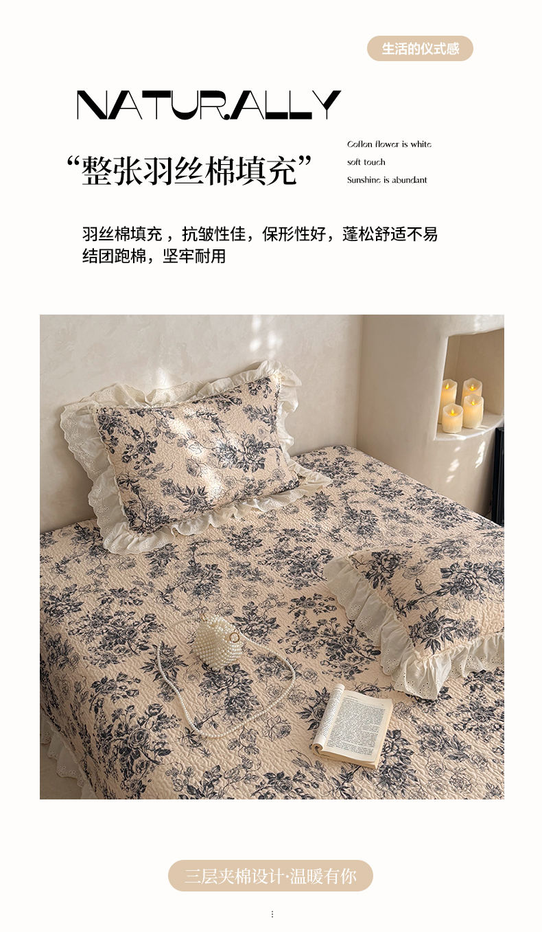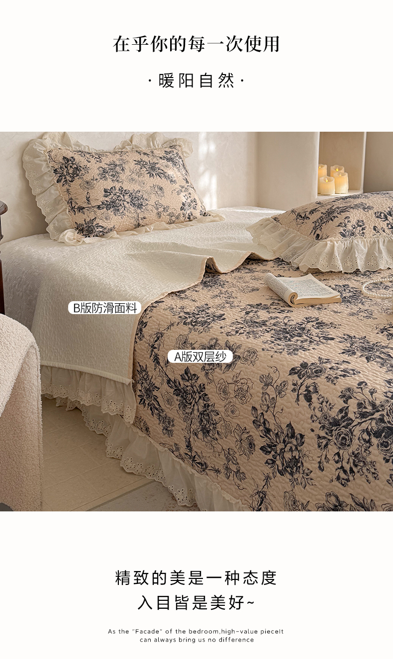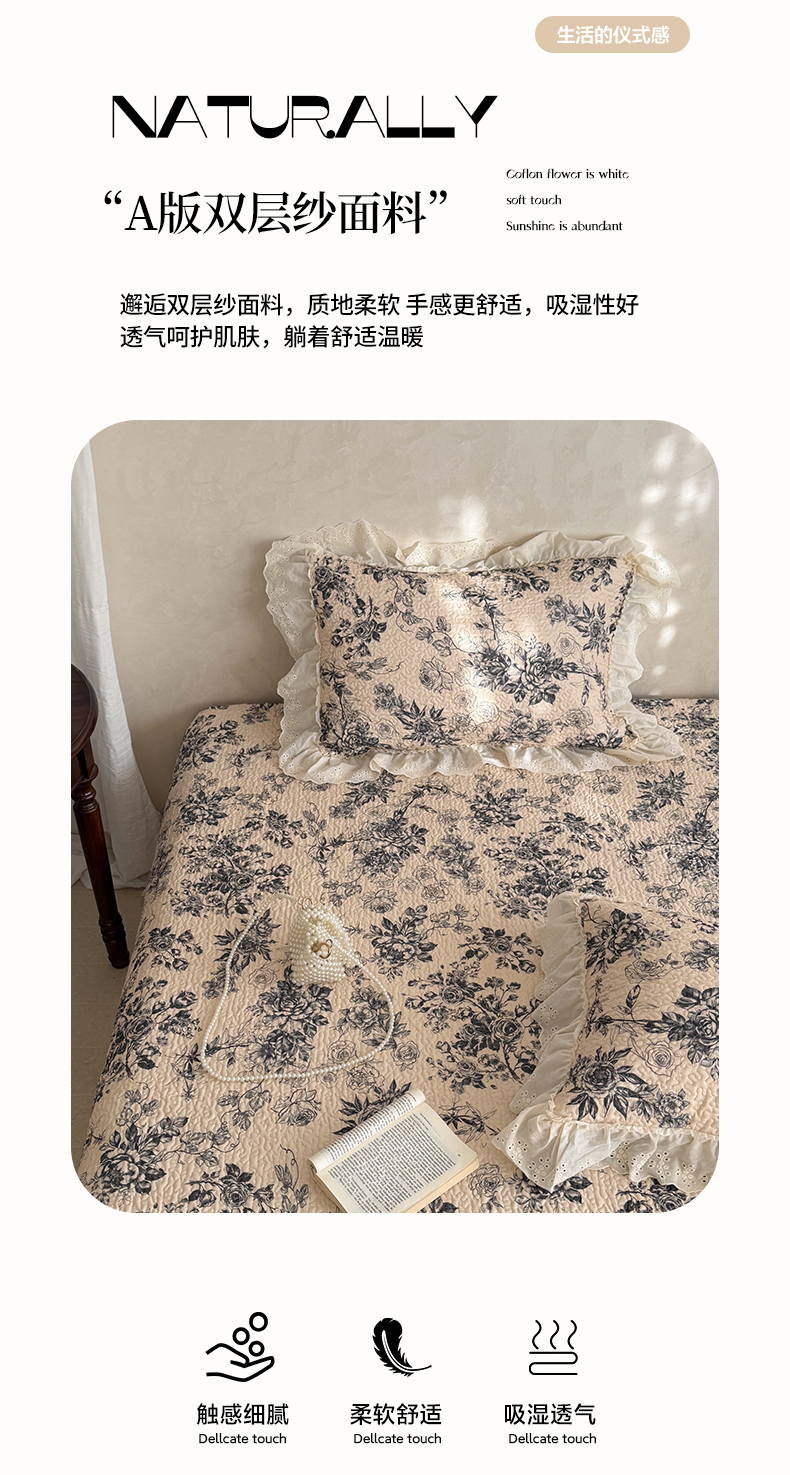 商品名称:琳可家居 2026新款印花全棉双层纱床盖棉布花边高温水洗A类标准夹棉可机洗 玫瑰故事