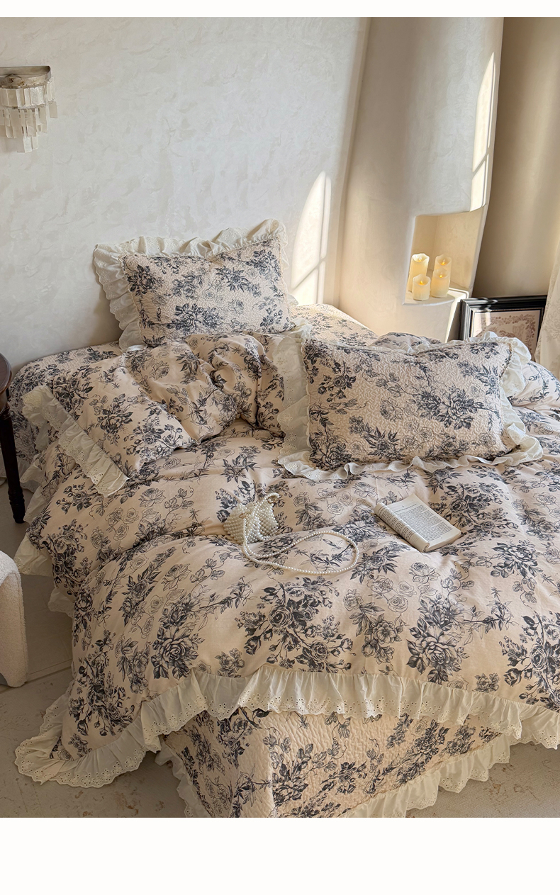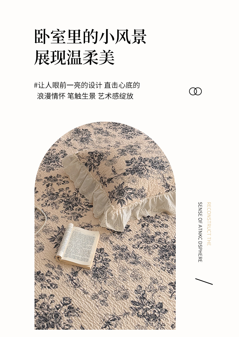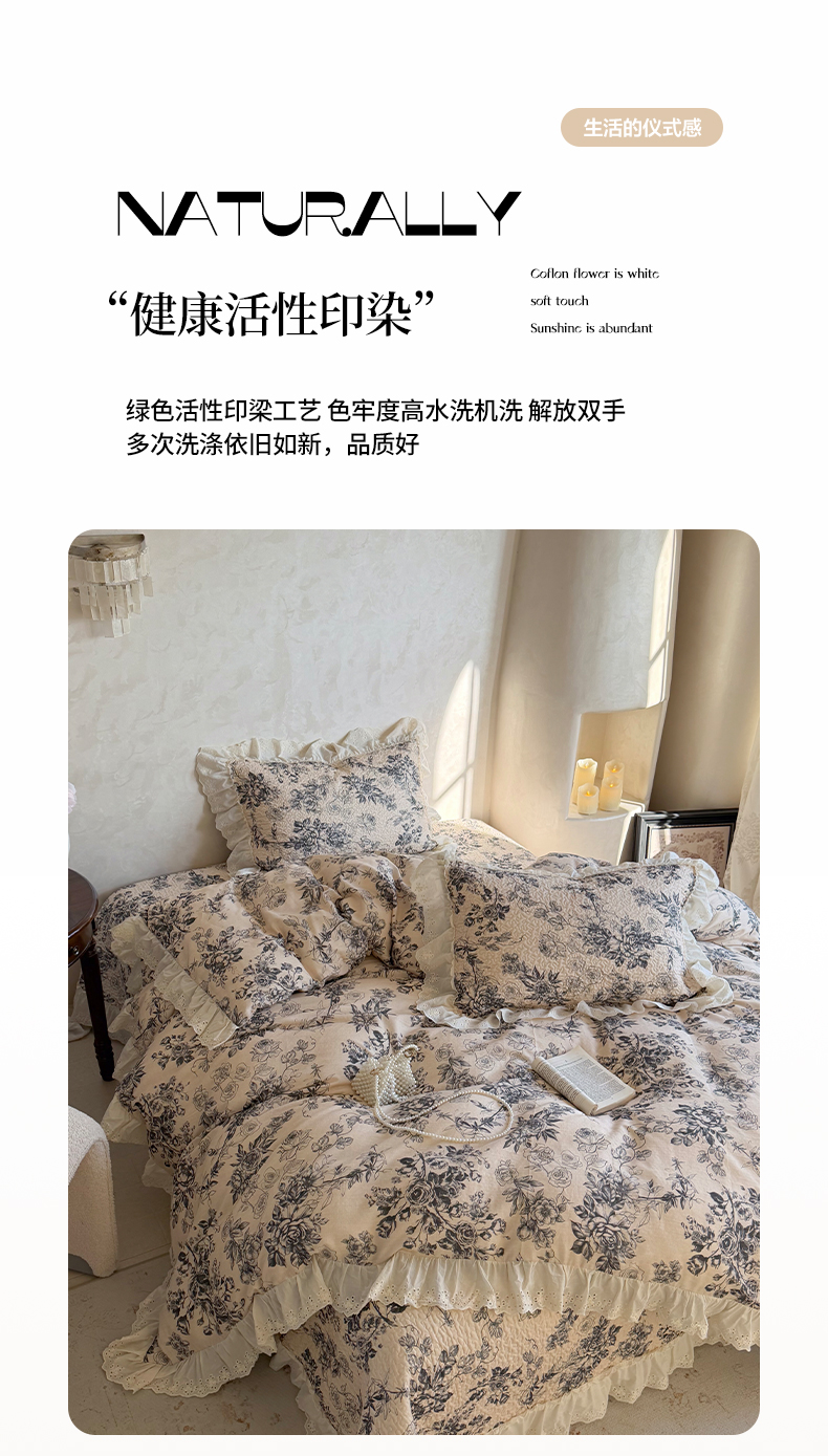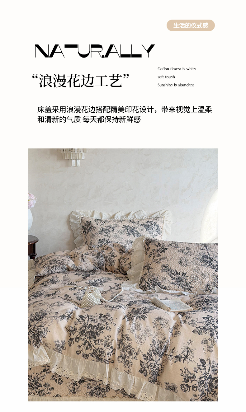 商品名称:琳可家居 2026新款印花全棉双层纱床盖棉布花边高温水洗A类标准夹棉可机洗 玫瑰故事