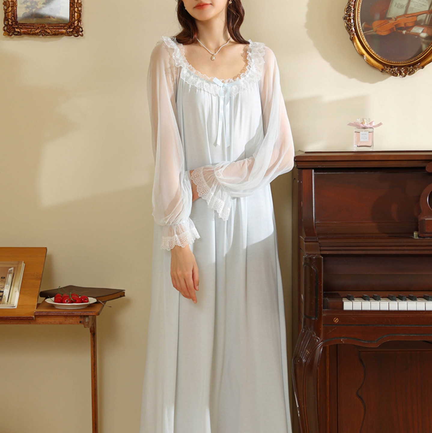 洛兰沙家居馆 2026新款宫廷风甜美公主法式复古宽松圆领女春秋针织棉长袖睡衣睡裙 蓝色