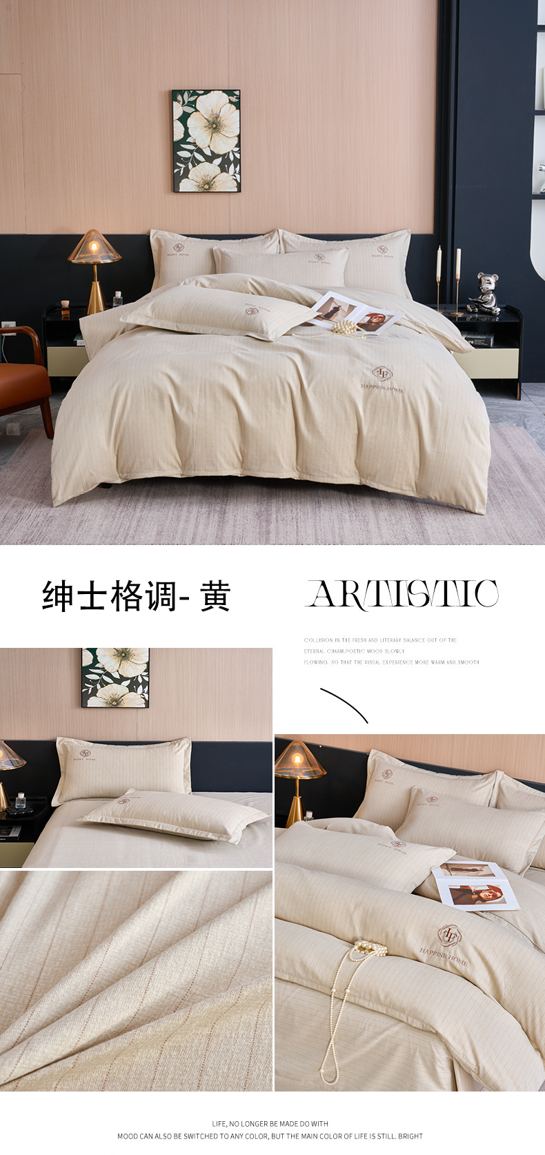 喜四方 2026年新款加厚全棉印花加绣花四件套 绅士格调-黄