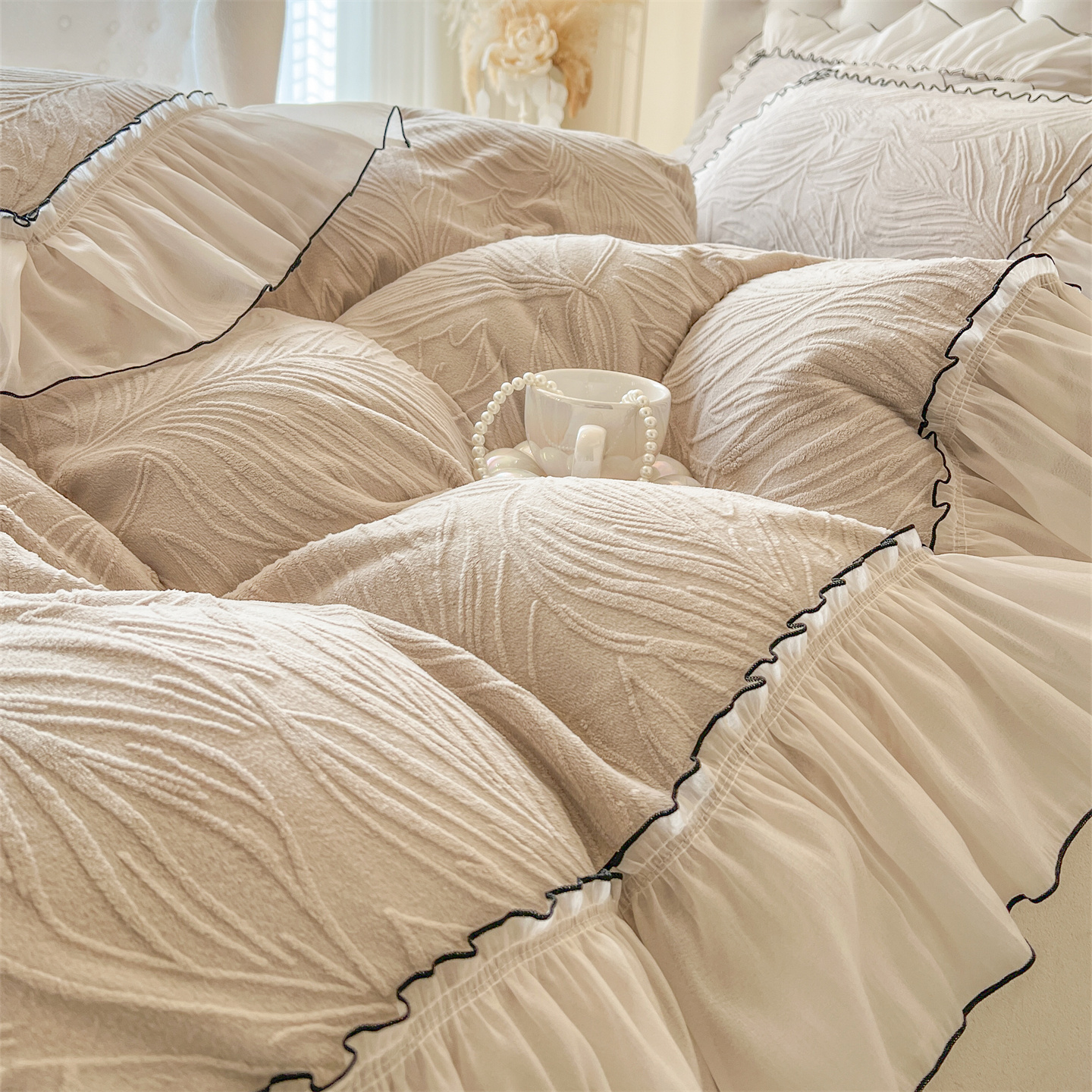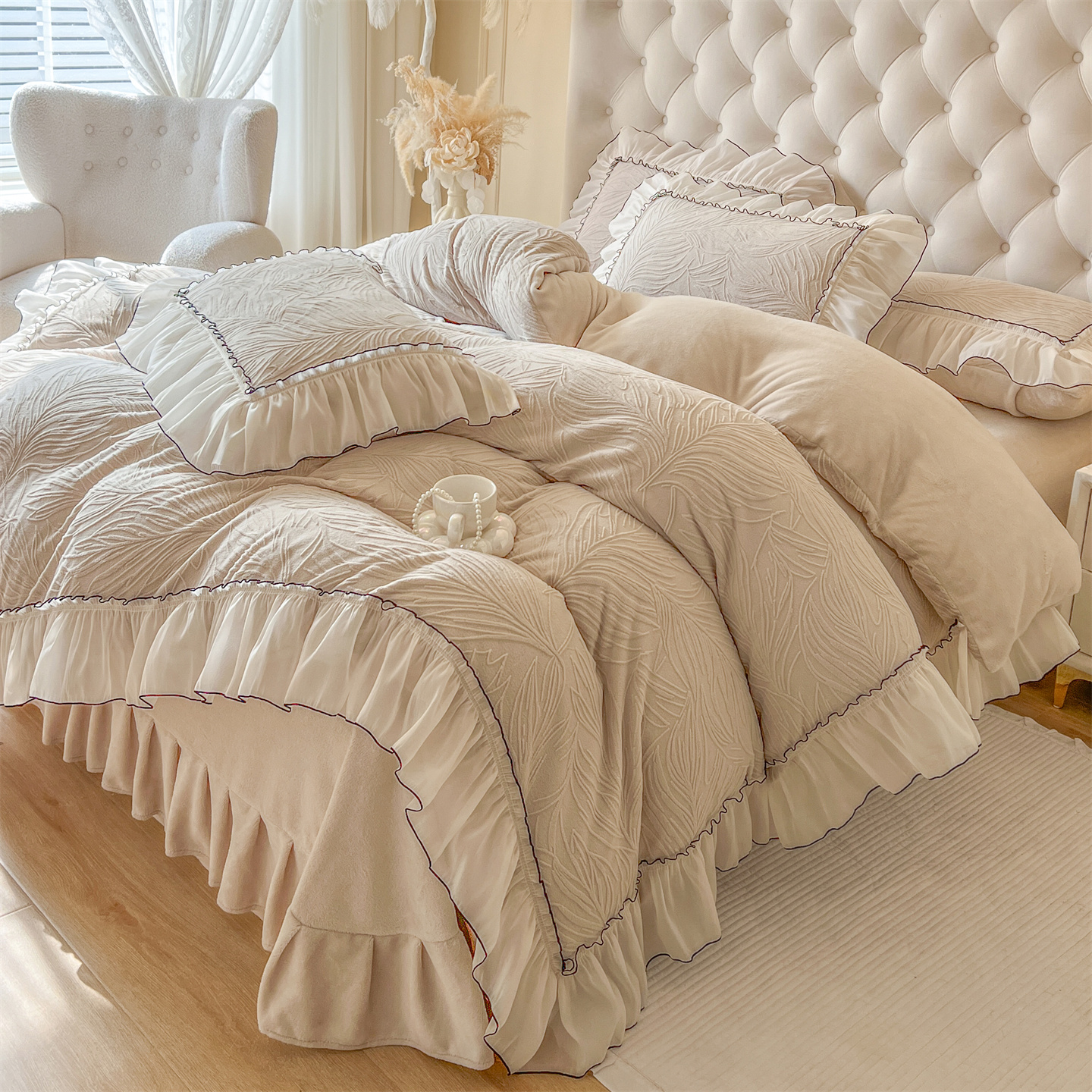 商品名称:满座家居 2025爆款230克高克重雕花牛奶绒床盖四件套 金枝玉叶-米灰