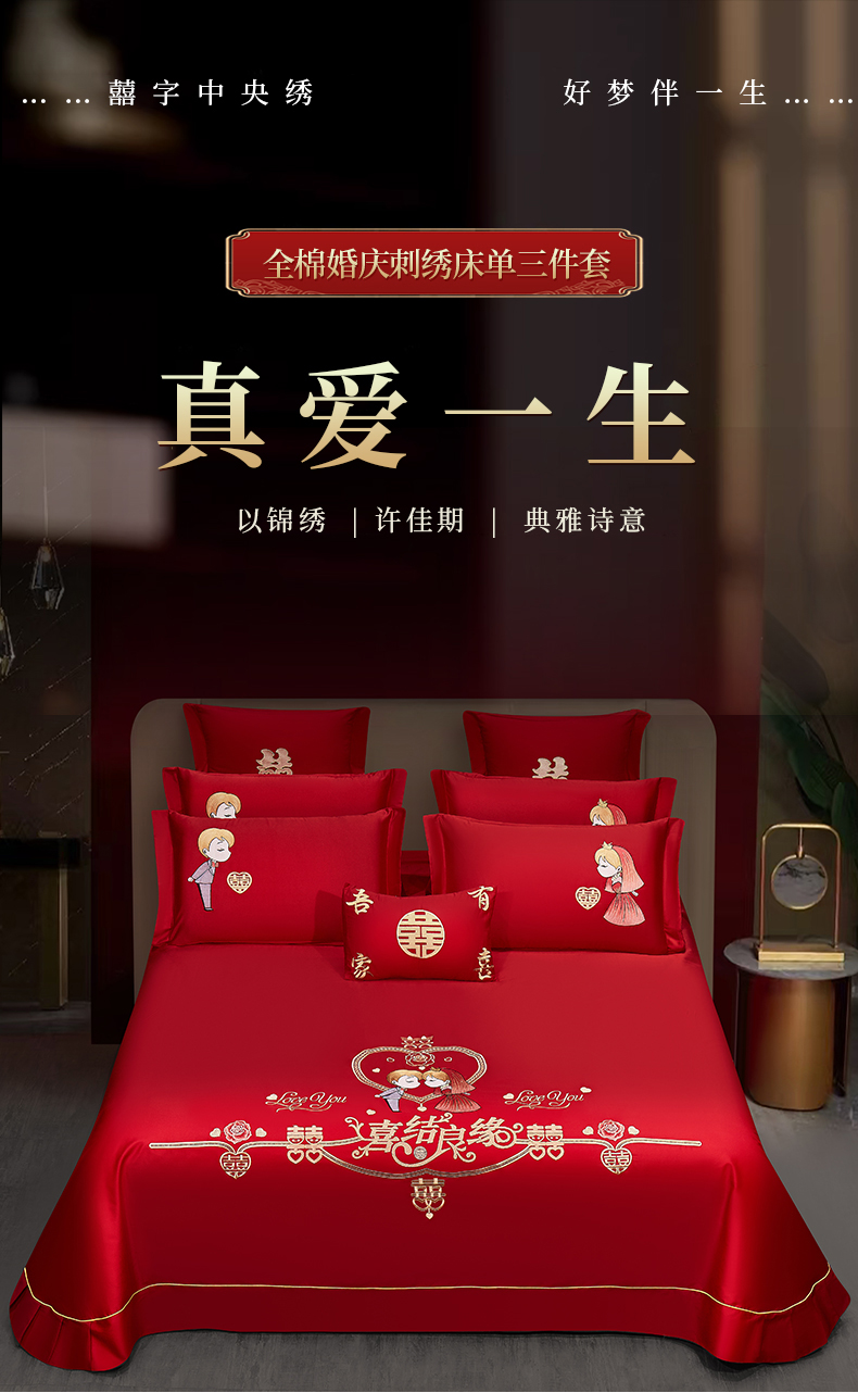 床上用品 > 床单 > 浩情国际婚庆供货中心 2026新款长绒棉100%纯棉全棉结婚刺绣婚庆床单单件绣花纯色三件套单品婚庆枕套长期供货 提供买家秀 真爱一生-绣花款