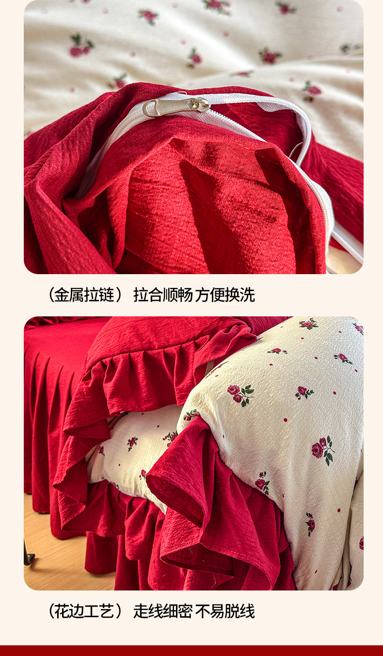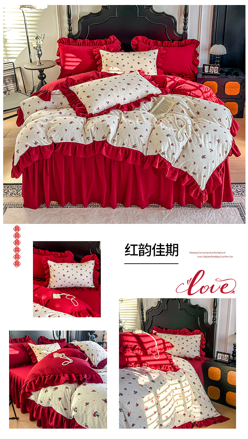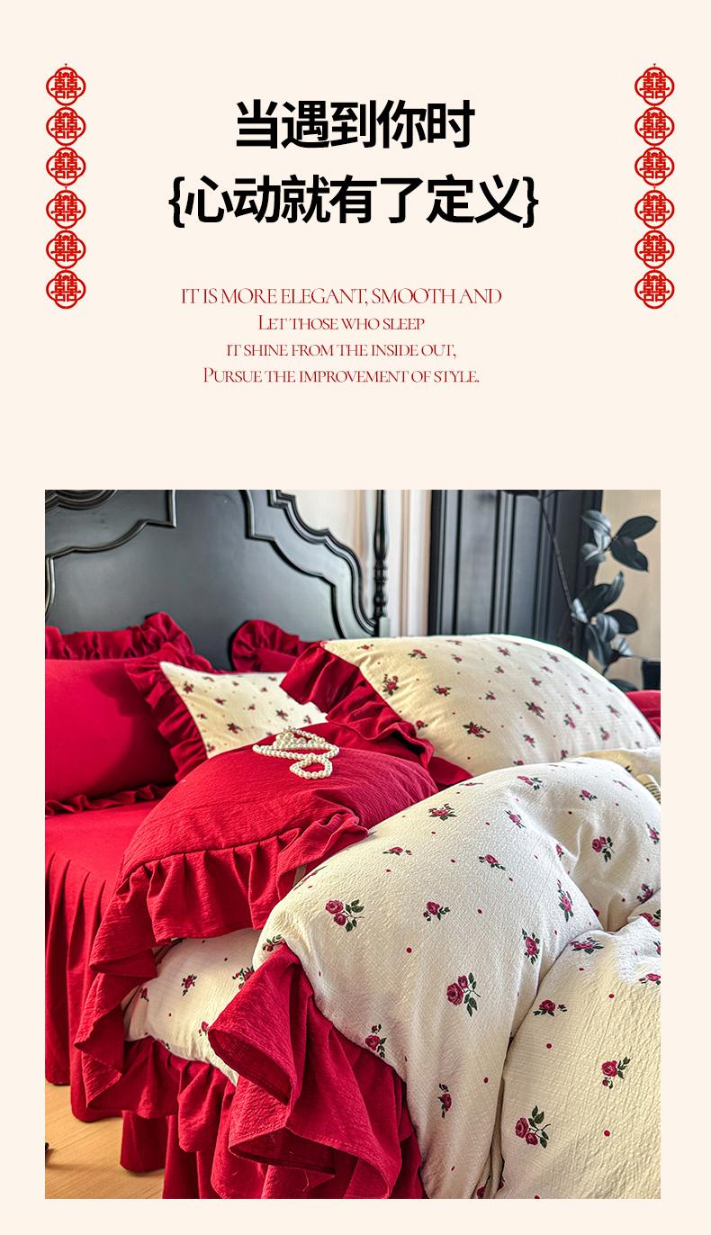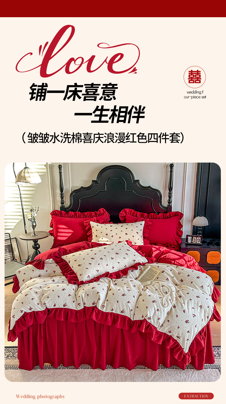 当前位置: 91家纺网 > 商品网购 > 床品套件 > 四件套 > 其它四件套 > 贝凯瑞 2026仿棉皱皱纱双层纱木棉仿棉水洗棉喜庆浪漫大红四件套-红韵 红韵佳期