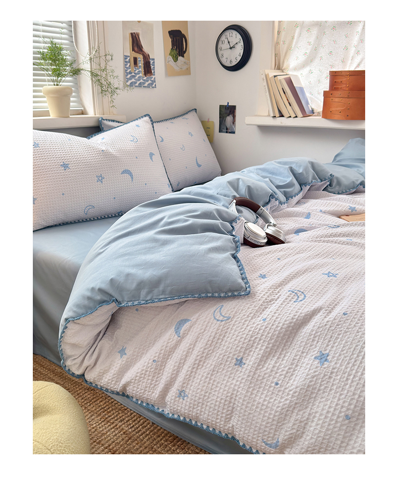 商品名称:曼之夏 2026新款A类全棉华夫格提花贝壳边四件套 云梦星河-兰
