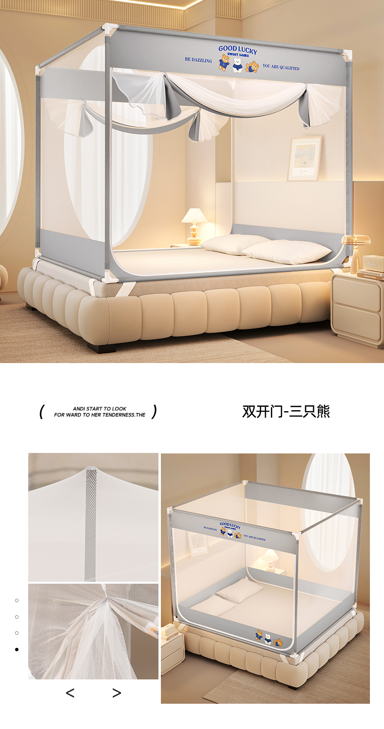 (总)青竹苑 2026新款三门全底外穿坐床式蚊帐儿童防摔防蚊拉链方帐,咘咘灰,大地灰,可可猫,浅米咖,若草绿,松果蓝,条纹星蓝,熊趴趴,夜光灰