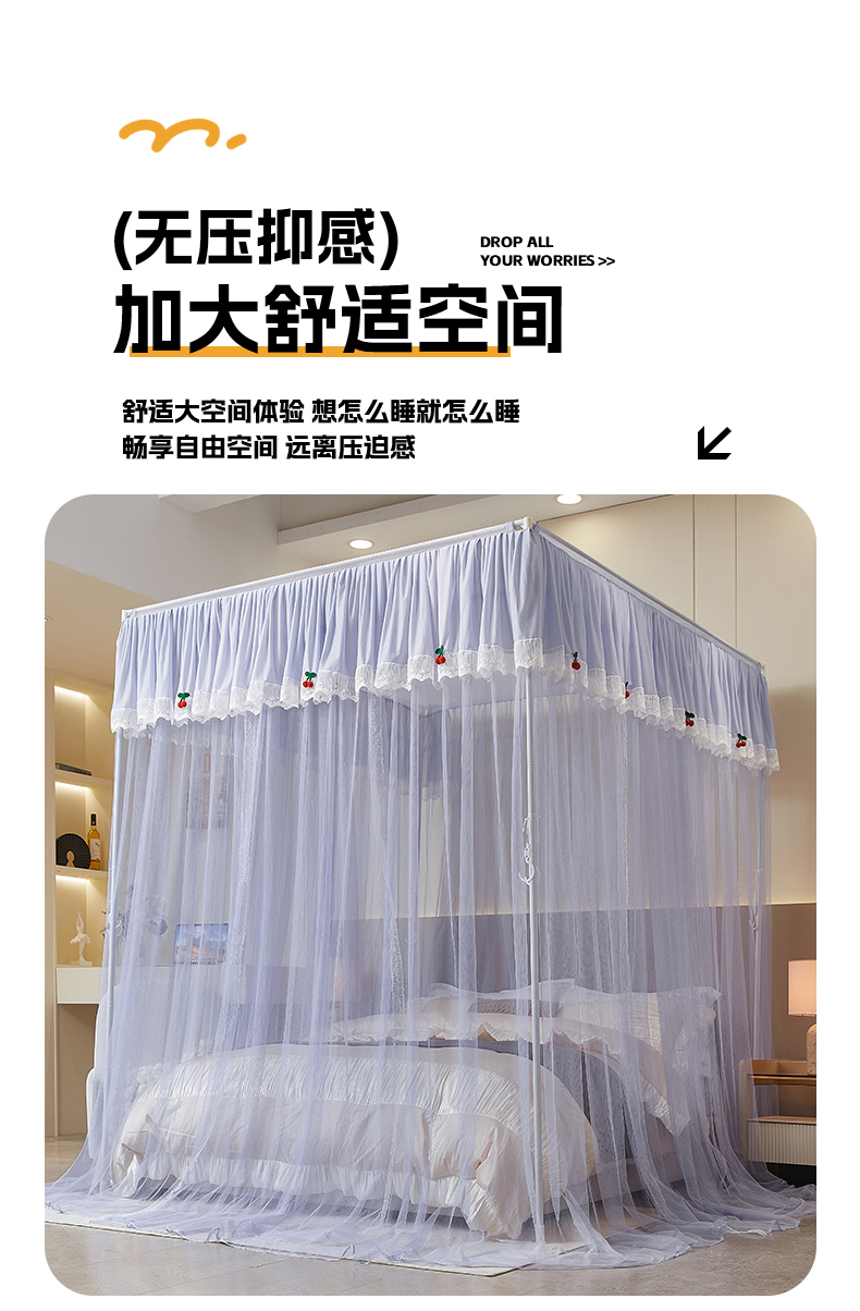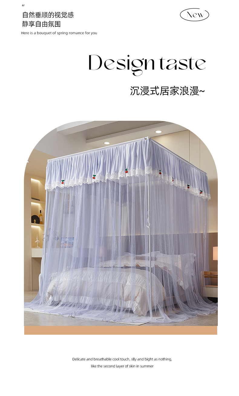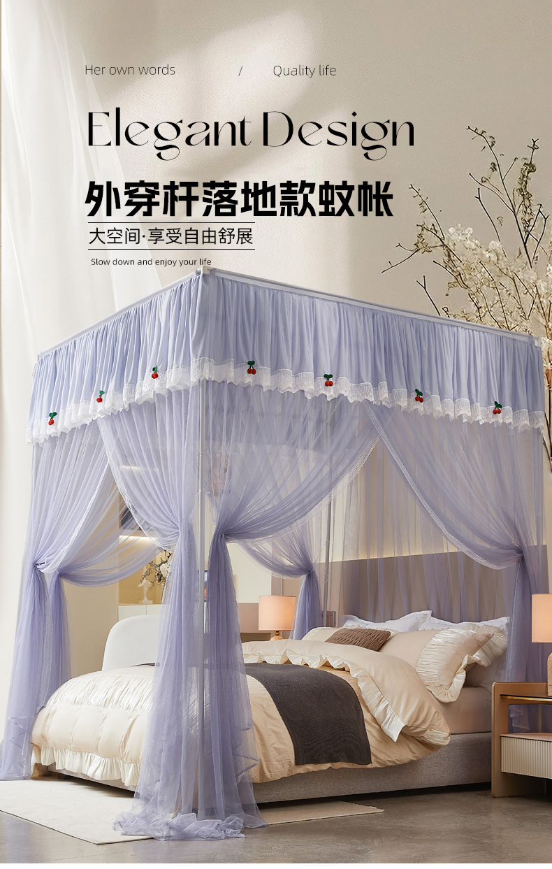 当前位置: 91家纺网 > 商品网购 > 床上用品 > 蚊帐 > 坐床式蚊帐 > 雪姿家纺 2026新款刺绣花边落地宫廷外穿杆蚊帐-落地樱桃 刺绣花边樱桃-烟岚紫灰