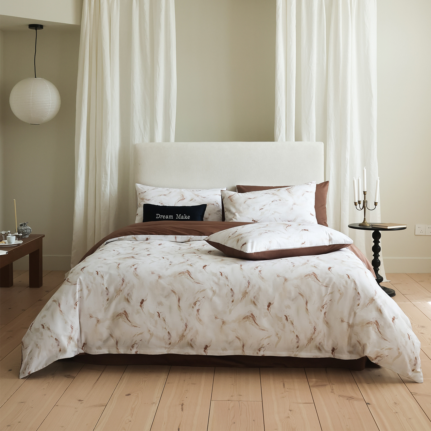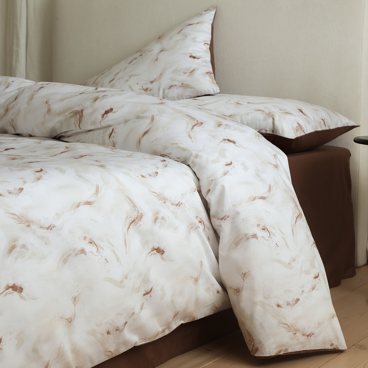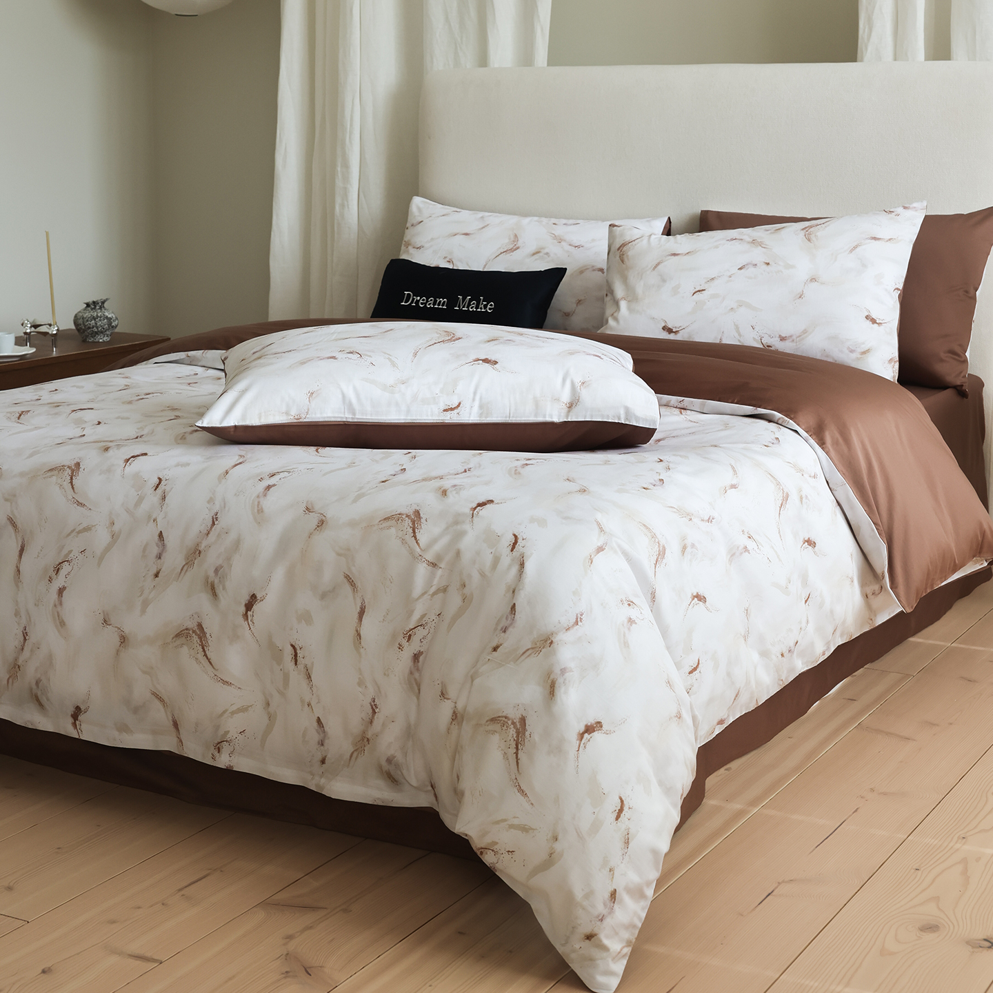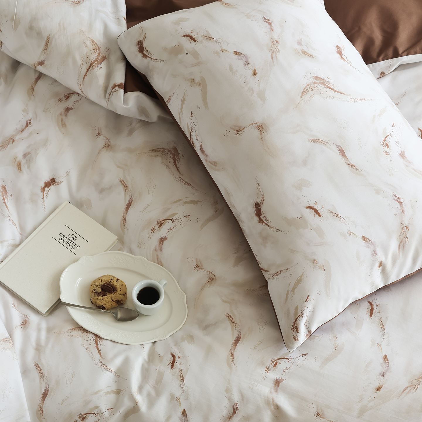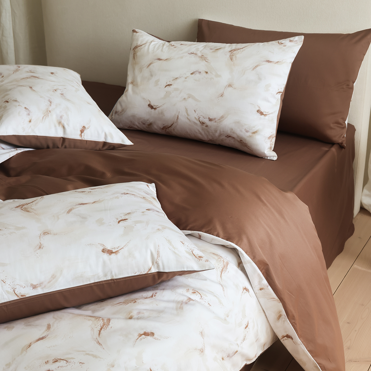 商品名称:ONE TWO ONE 121 【会员-20】【控价商品】【提供买家秀】【专版花型】2026新款100s长绒棉全棉床上用品数码印花四件套-听潮絮语 听潮絮语-暖咖