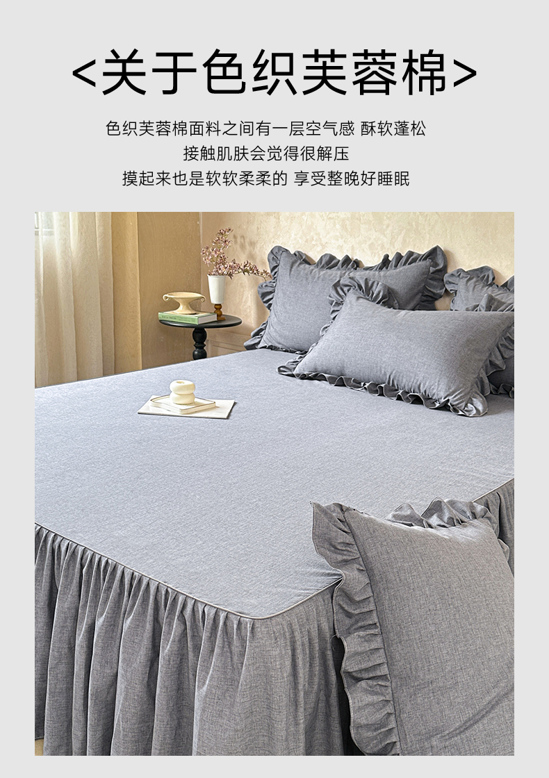 (总)忘忧草 2025新款色织水洗全棉床笠式床裙夹棉款纯棉花边床笠-花颜系列,花颜-白,花颜-粉,花颜-灰,花颜-咖,花颜-蓝,花颜-绿