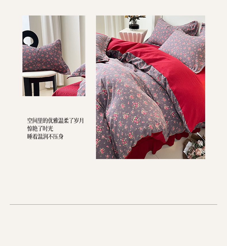 (总)麦田家纺 2026新款皱皱水洗棉床盖款四件套,玫瑰园,安妮,繁花,海德花园,卡地亚-红,樱桃蜜语
