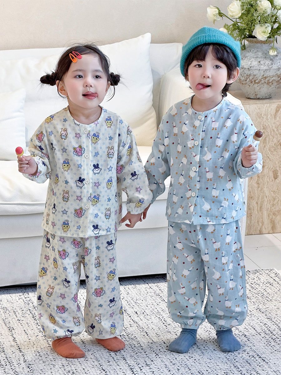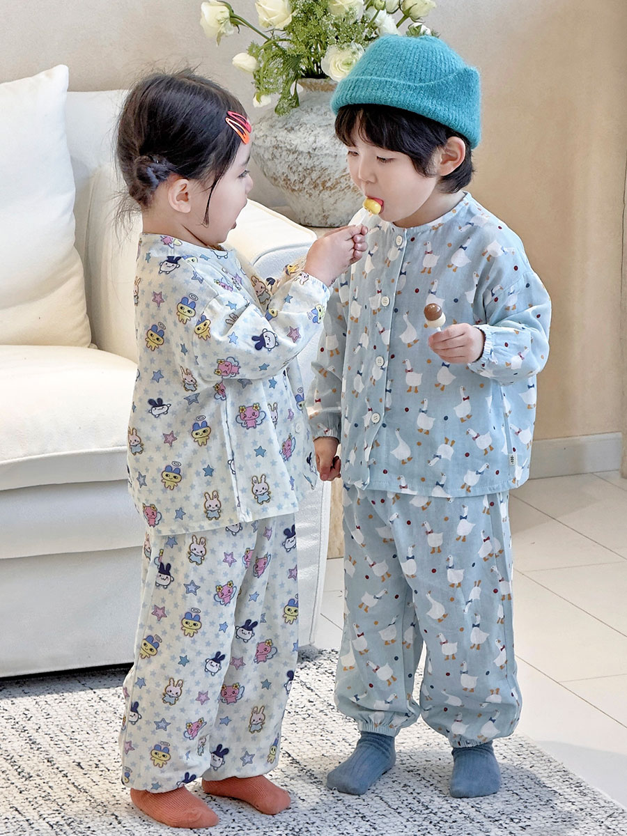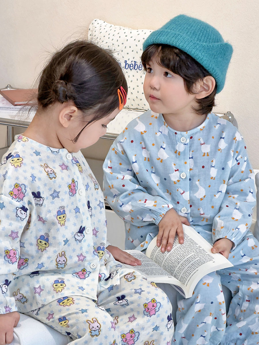当前位置: 91家纺网 > 商品网购 > 居家日用 > 睡衣/家居服套装 > (总)妍景家居生活馆 2026新款儿童纱布纯棉全棉蓝底绅士鹅+星星卡通兔套装
