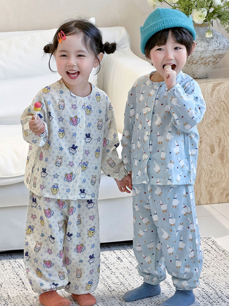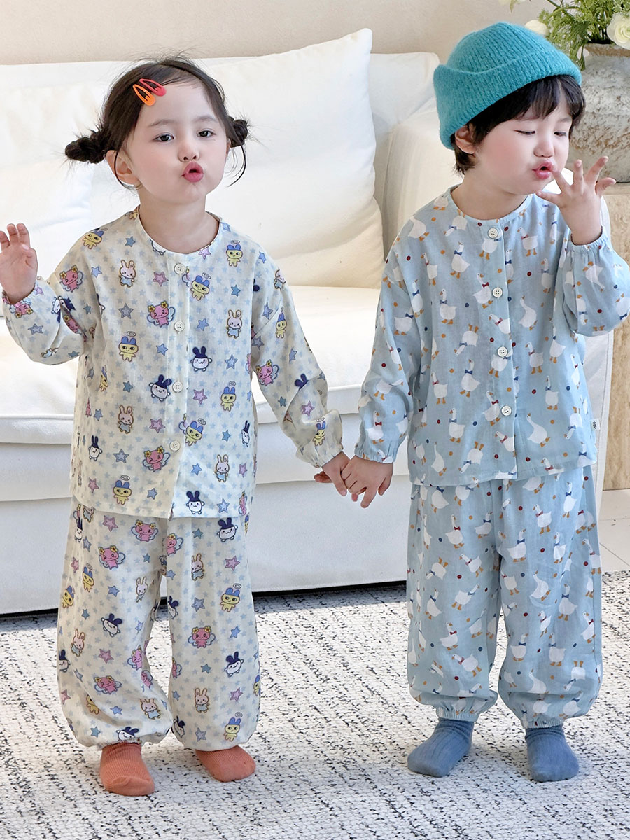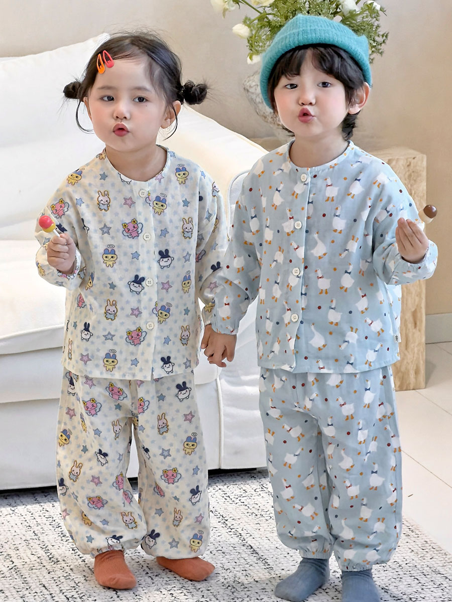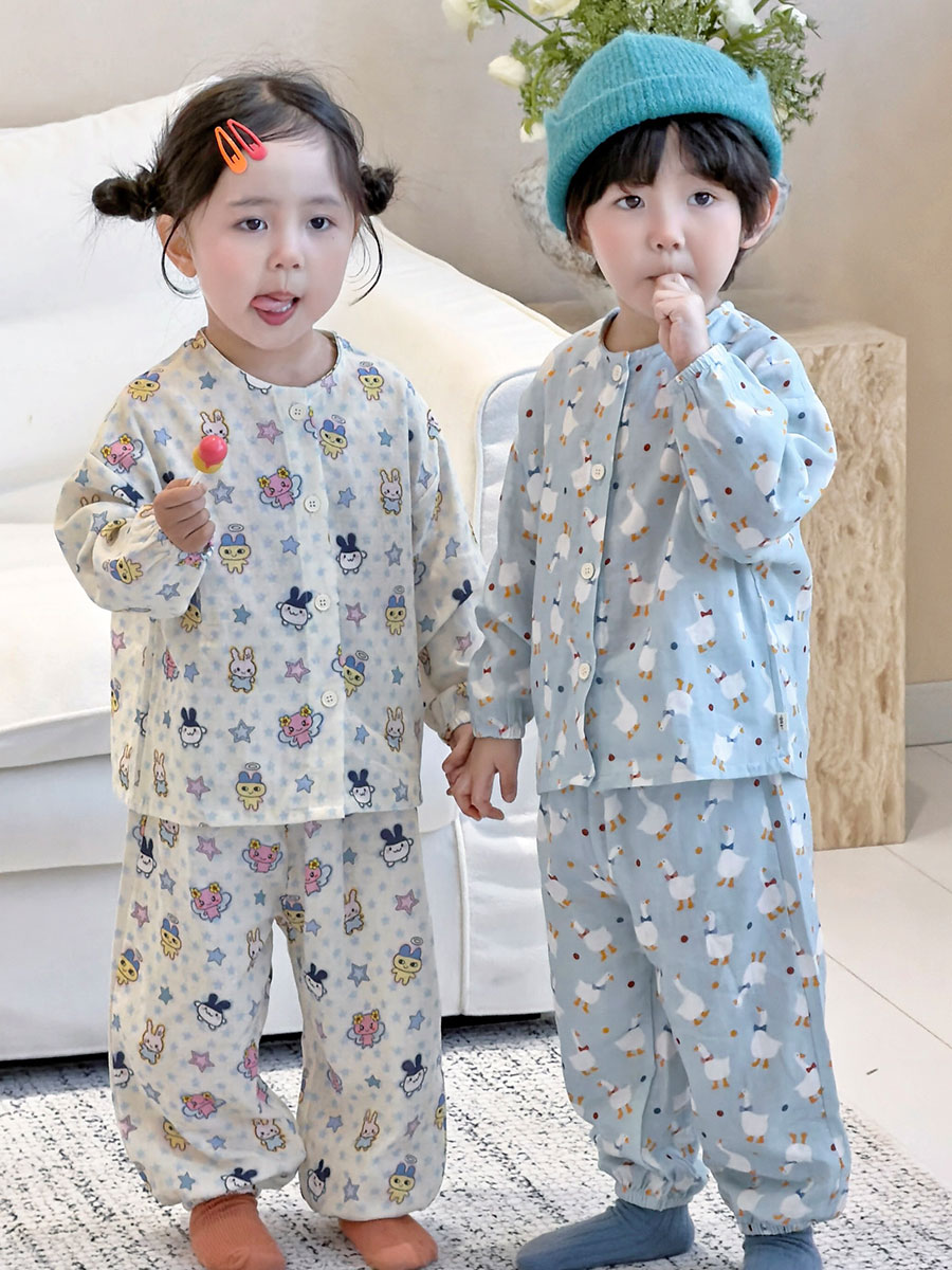 当前位置: 91家纺网 > 商品网购 > 居家日用 > 睡衣/家居服套装 > (总)妍景家居生活馆 2026新款儿童纱布纯棉全棉蓝底绅士鹅+星星卡通兔套装
