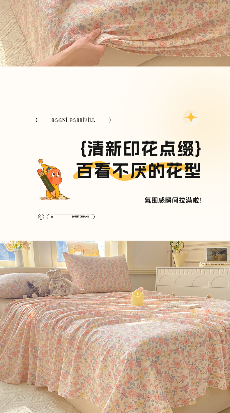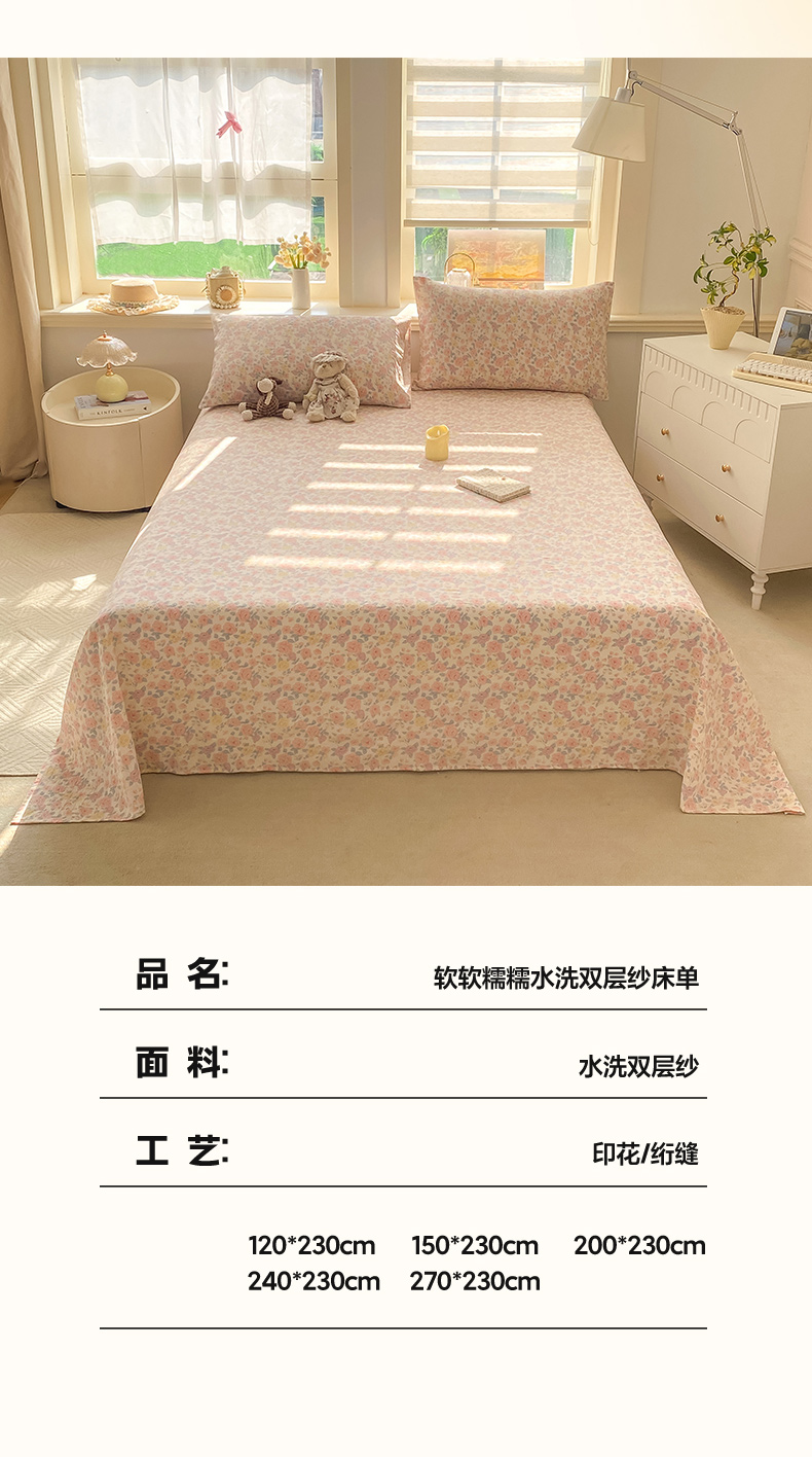 (总)晓时候 2026新款A类云感双层纱床单三件套单品单件床单,安然入夏,缤纷水果,冰川灰,豆蔻,多彩波点,繁花,蝴蝶结-紫,花间兔,蓝色泡芙狗,洛神花间,萌宠派对,萌萌星星人,奶芙狗,柠檬黄,芊芊花语,牵牛紫,俏皮狗,青春蓝,青竹绿,甜甜西高地,甜心女孩,小确幸,星星喵,樱花粉,云朵白