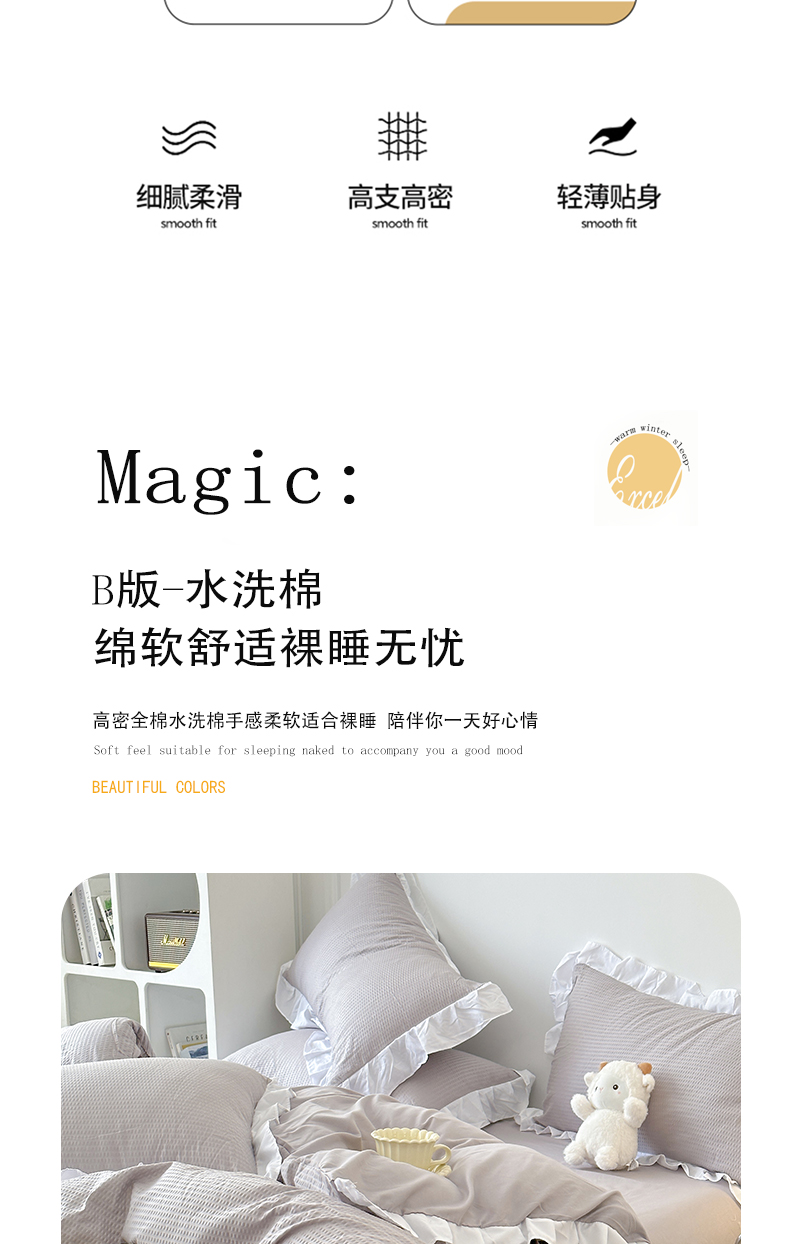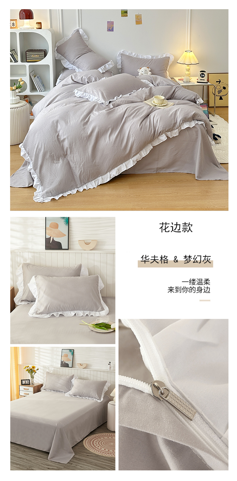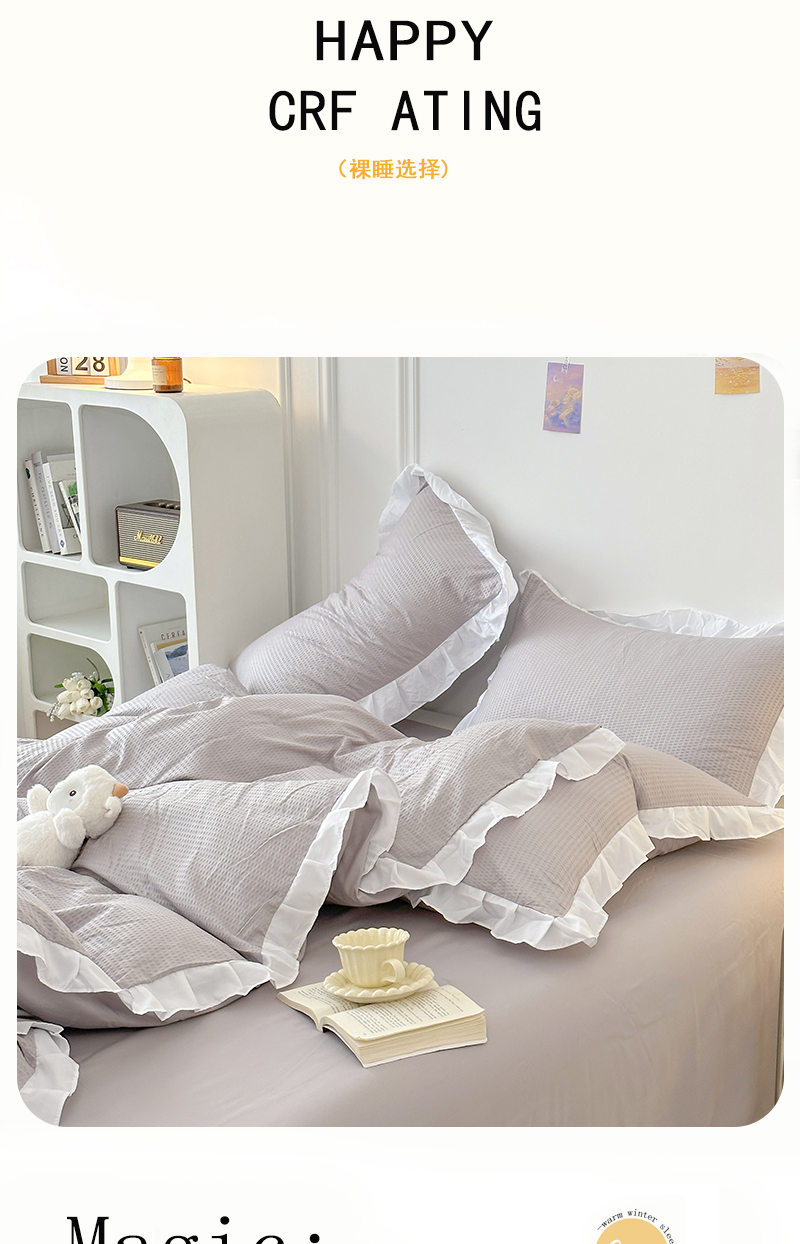 商品名称:啊雅家居 2026新款轻奢韩式花边华夫格四件套-花边款 花边款 梦幻灰