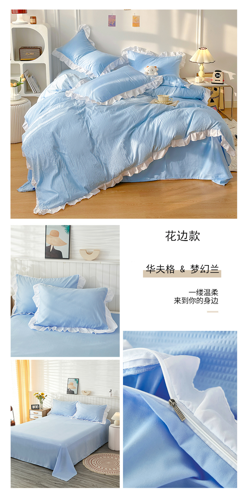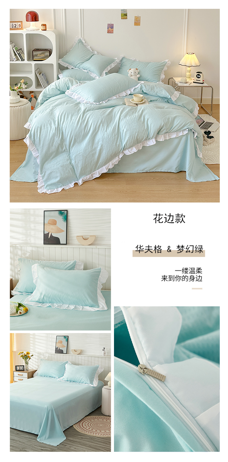 (总)啊雅家居 2026新款轻奢韩式花边华夫格四件套,梦幻粉,梦幻黄,梦幻灰,梦幻兰,梦幻绿