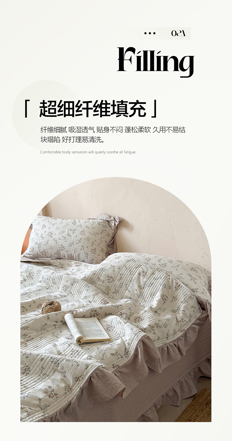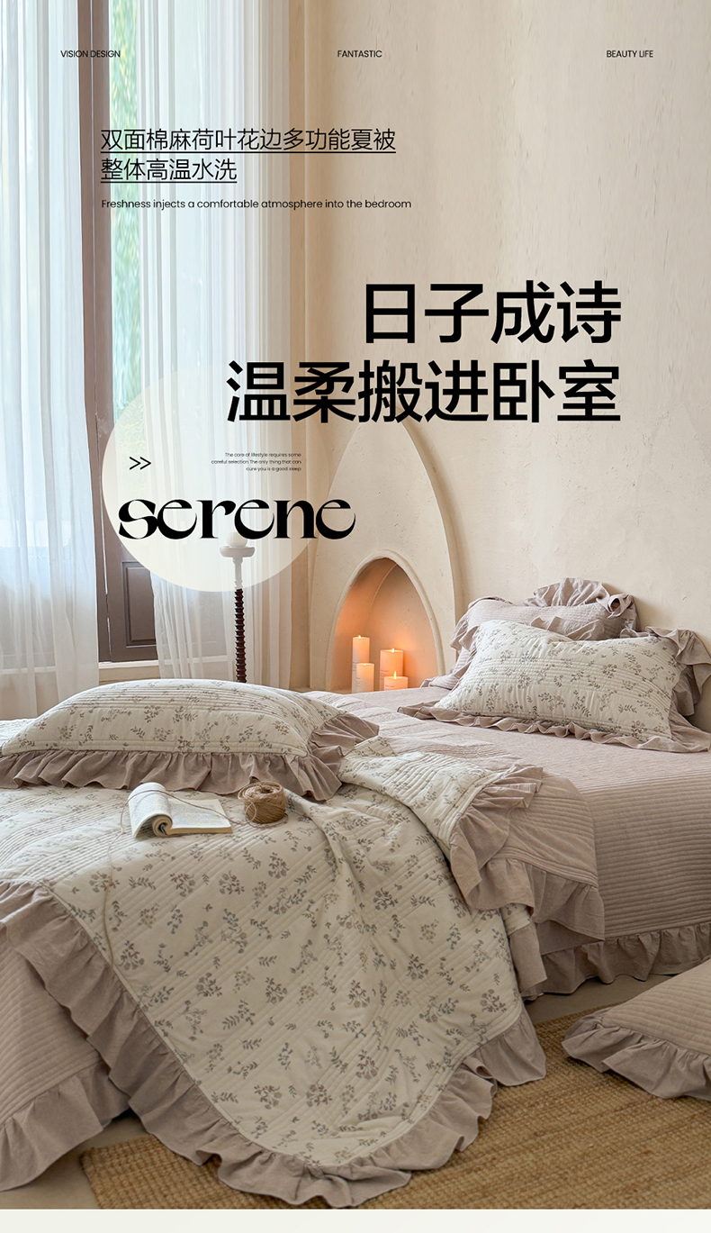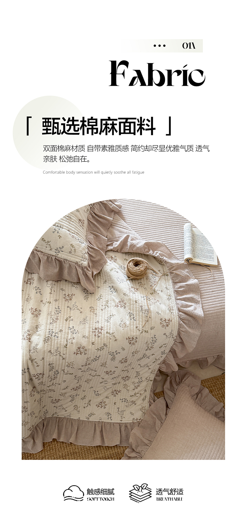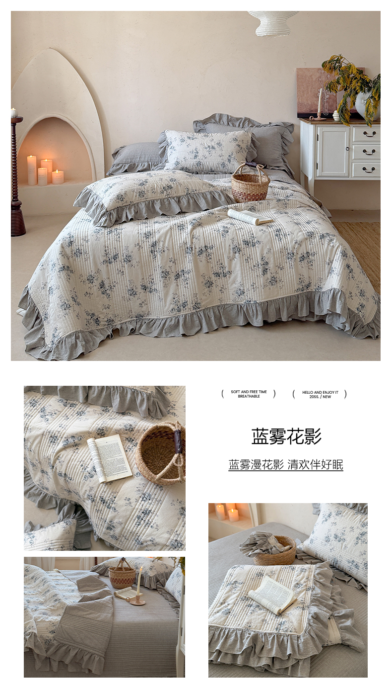 (总)漫调家纺 2026春夏新品双面棉麻法式荷叶边高温水洗夏被可配夏被四件套床单床盖四件套(夏被四件套咨询微信),粉雾花甸,蓝雾花影,奶杏枝蔓,青枝野果,组合