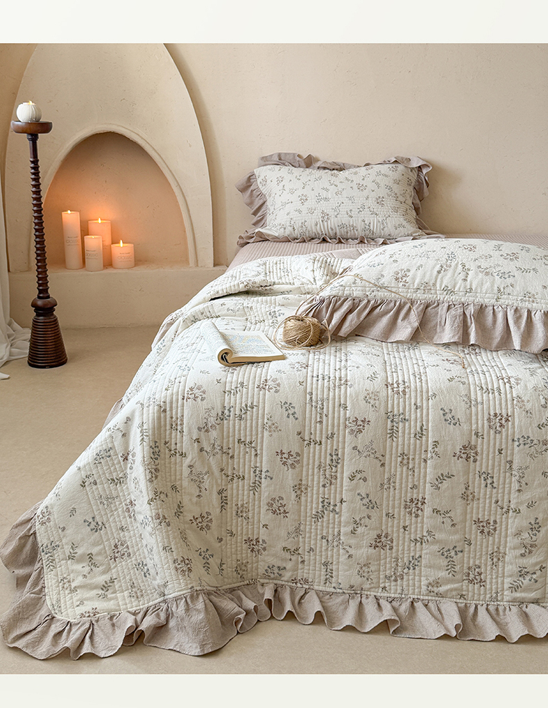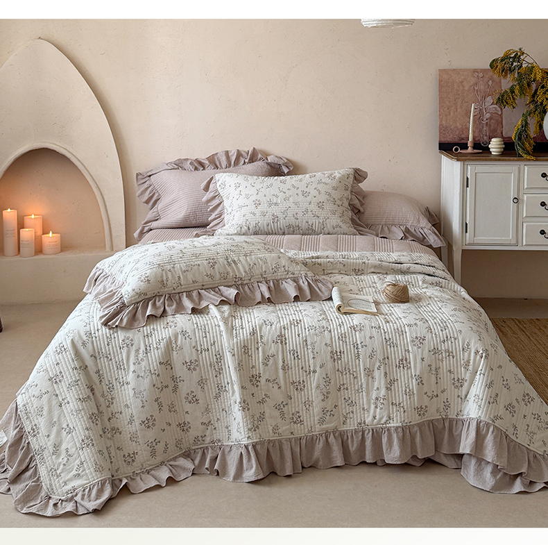 漫调家纺 2026春夏新品双面棉麻法式荷叶边高温水洗夏被可配夏被四件套床单床盖四件套 奶杏枝蔓