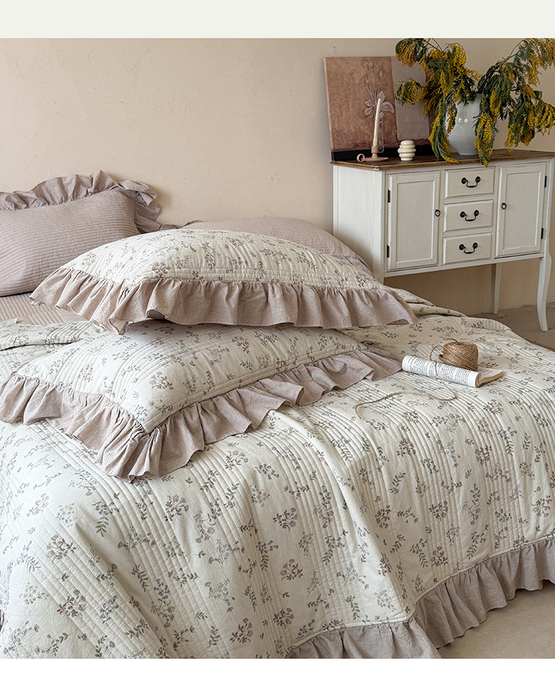 商品名称:漫调家纺 2026春夏新品双面棉麻法式荷叶边高温水洗夏被可配夏被四件套床单床盖四件套 奶杏枝蔓