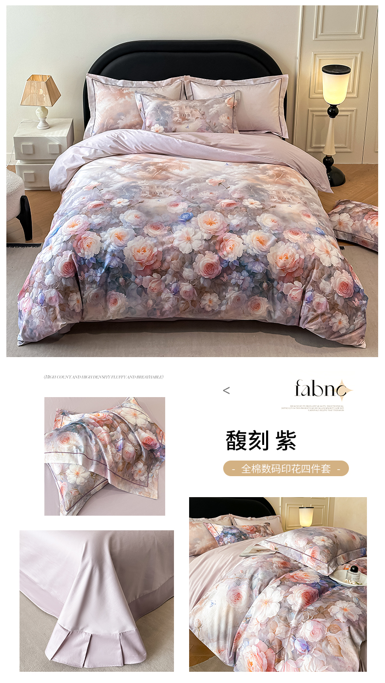 (总)启航家居 2025新款全棉铂金棉数码印花四件套,风香花倦,花的嫁纱,洛香忆梦绿,暮云春树灰,翩若惊鸿粉,普罗旺斯紫,新塞纳舞曲红,新塞纳舞曲紫