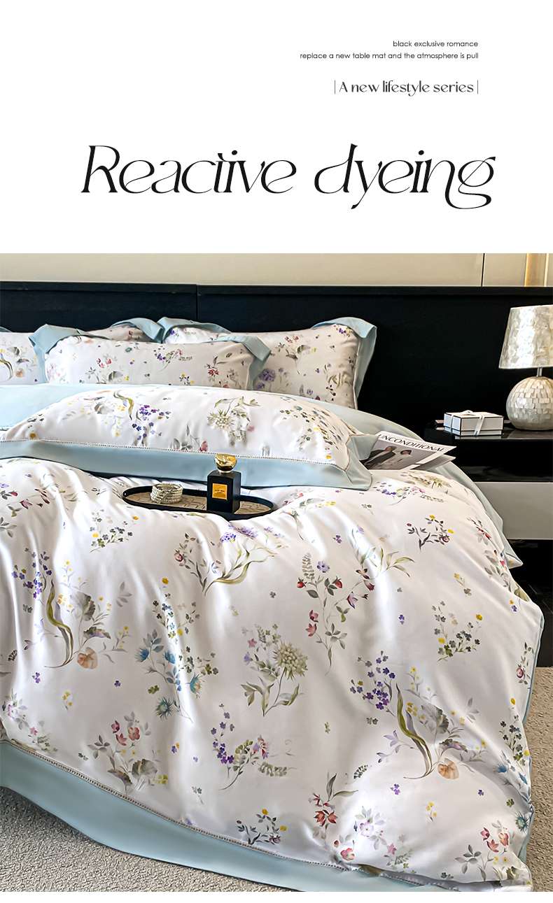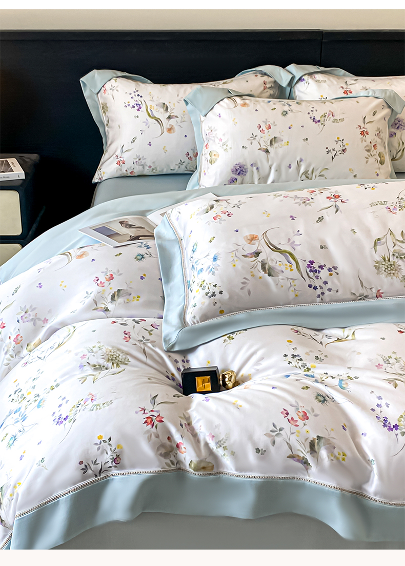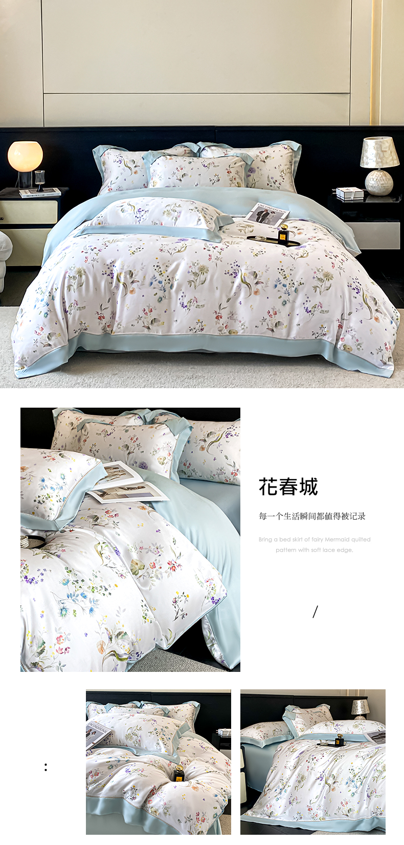 商品名称:博纳家纺 2026新款100%莱赛尔天丝四件套宽边拼角绣花工艺数码印花田园风轻奢凉感四件套(礼盒装) 花春城