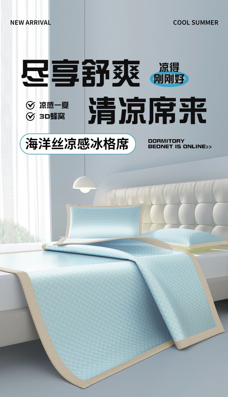 • 91家纺网 家纺一手货源 找家纺 (总)曼陀罗 2026新款凉感海洋丝冰咖条纹凉席-平铺款,冰川灰,天之蓝,草原绿,粉黛玉,海之蓝