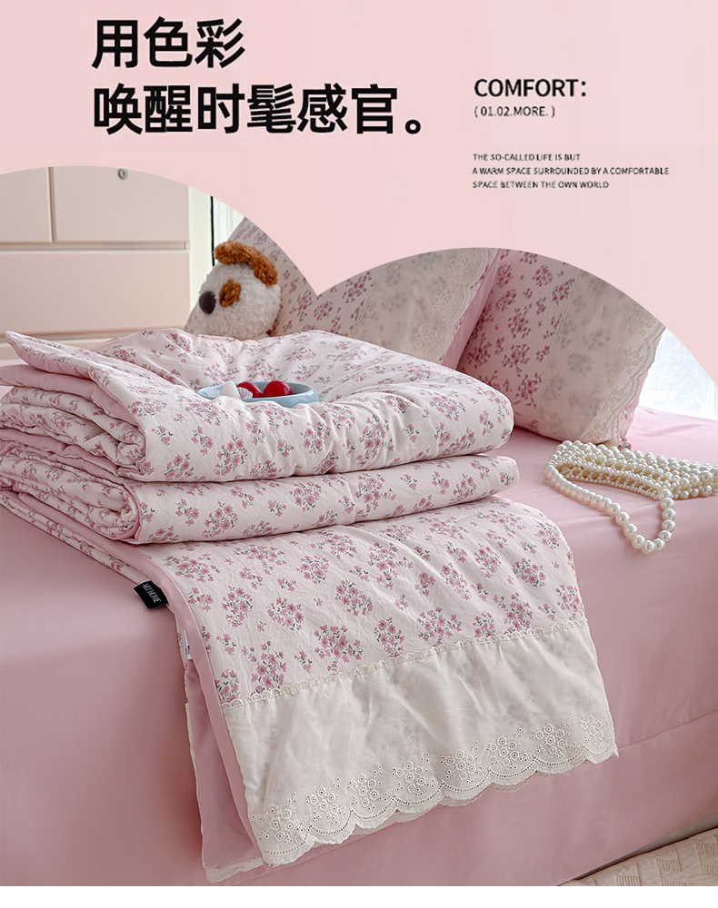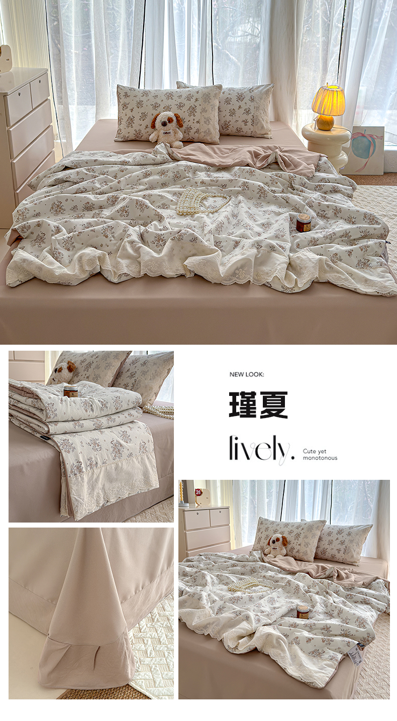 商品名称:竹合家纺 2026春夏新款古法水洗仿棉云感棉夏被四件套全棉花边印花夏凉被空调被 棠梨