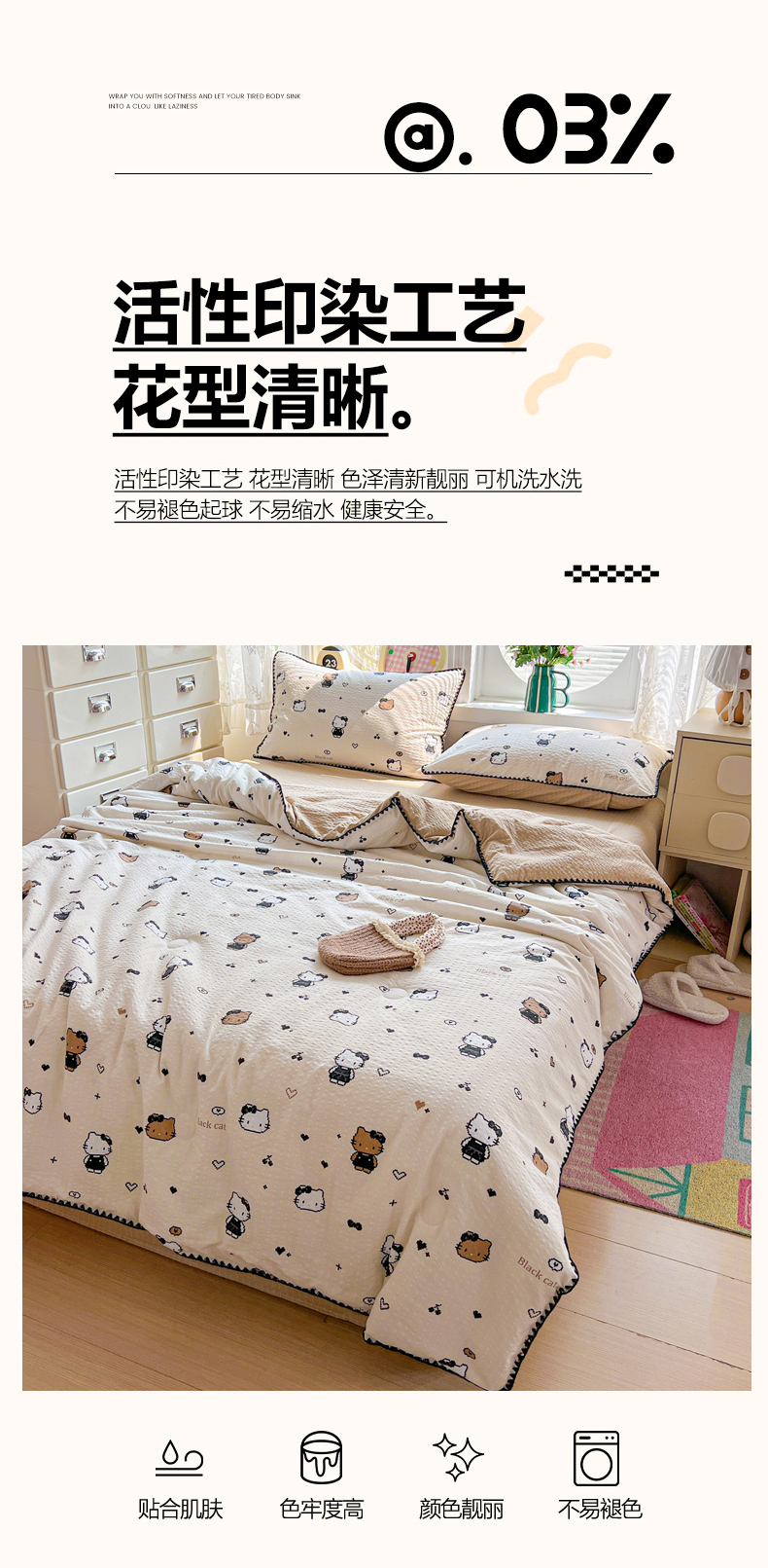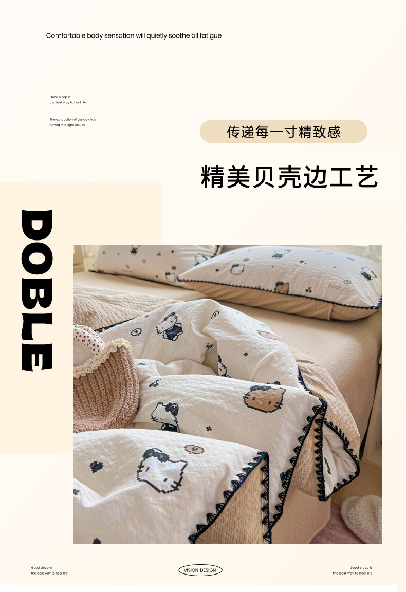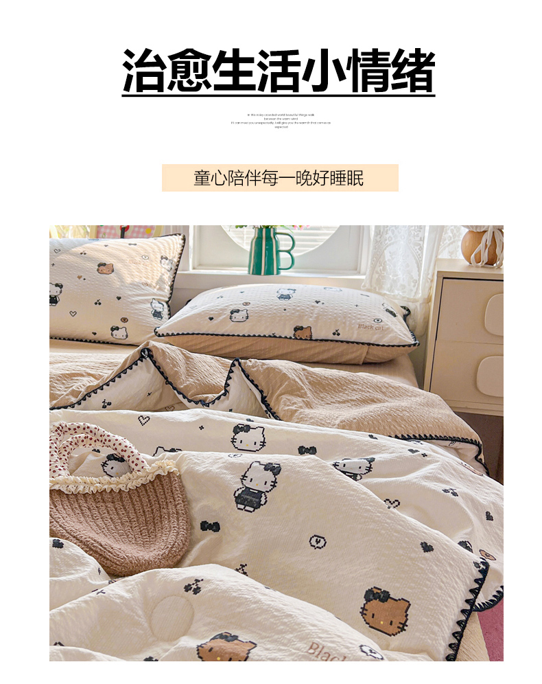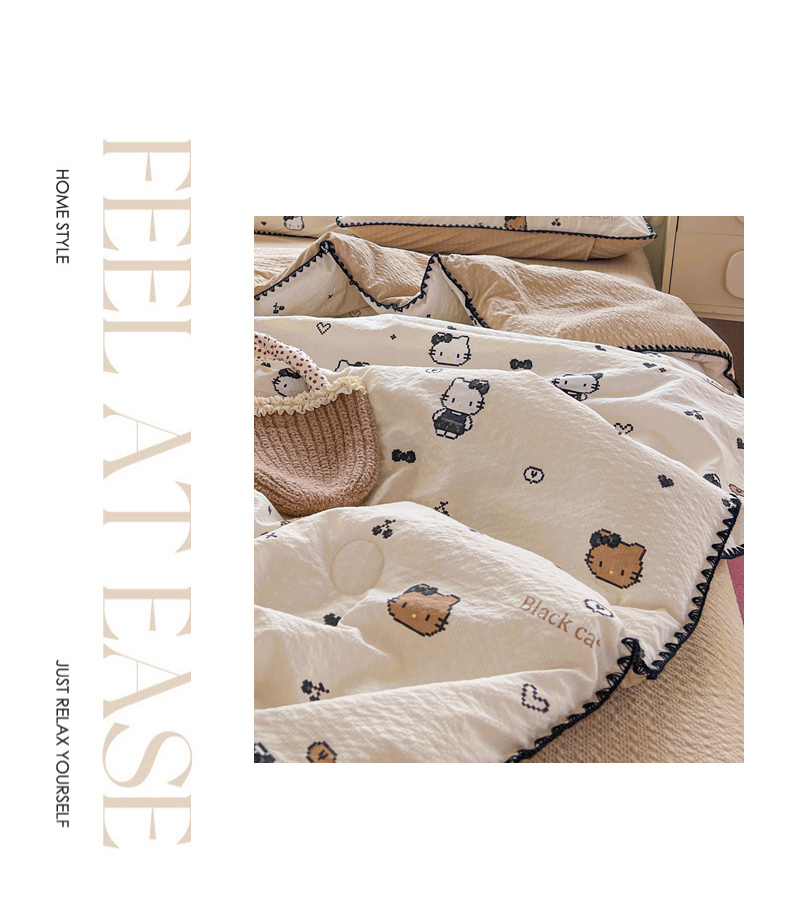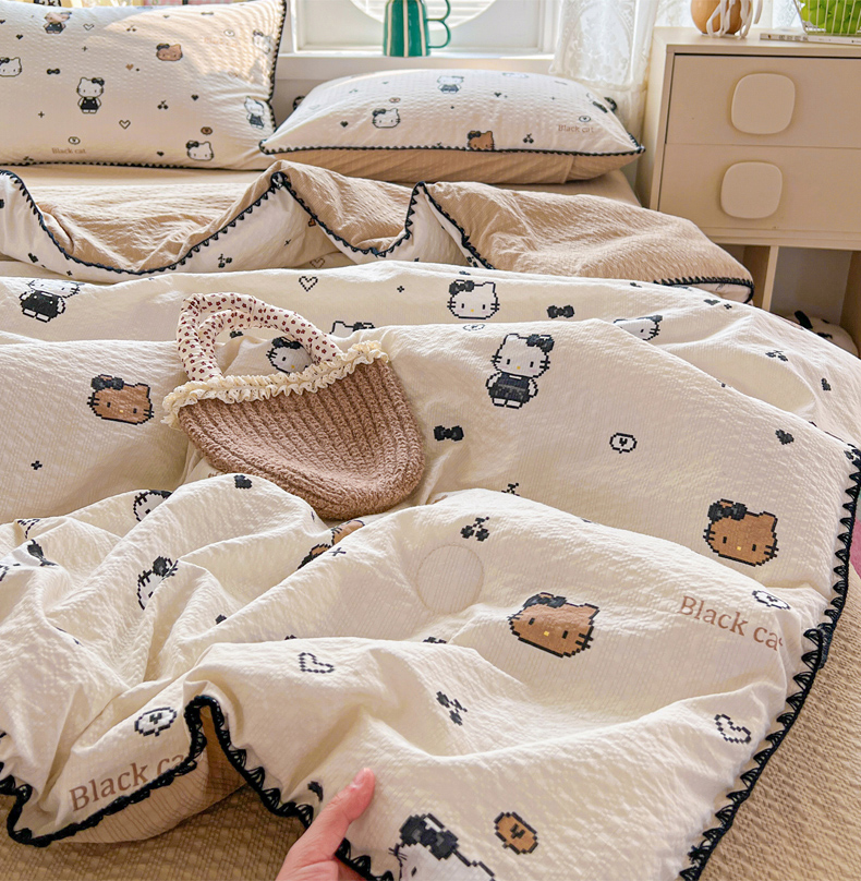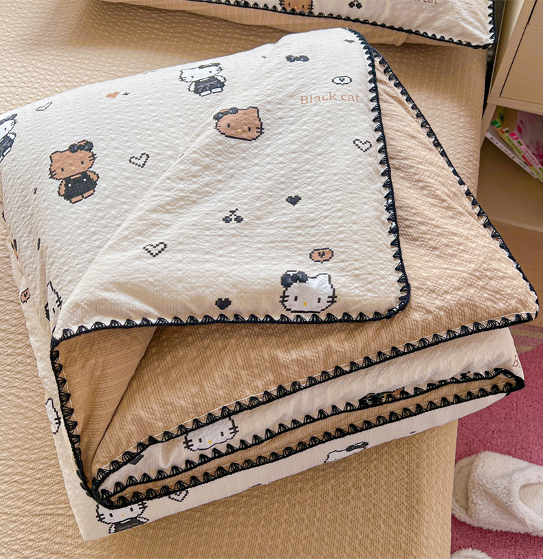 商品名称:恒尚居 2026新款A类泡芙纱贝壳边夏被夏凉被四件套空调被三角针绣边 【甜妹小猫】贝壳边