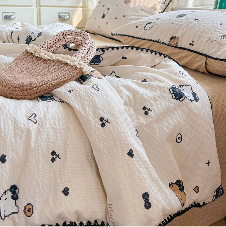 (总)恒尚居 2026新款A类泡芙纱床盖四套件泡芙棉双层纱小花边床垫床褥,波点奶芙小花边,彩虹木马小花边,费尔岛小狗小花边,粉糖泡泡猫小花边,兰格奶狗小花边,奶黄星星人小花边,细格木马小花边,阳光条纹小花边,字母喵喵小花边