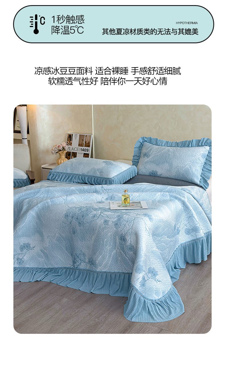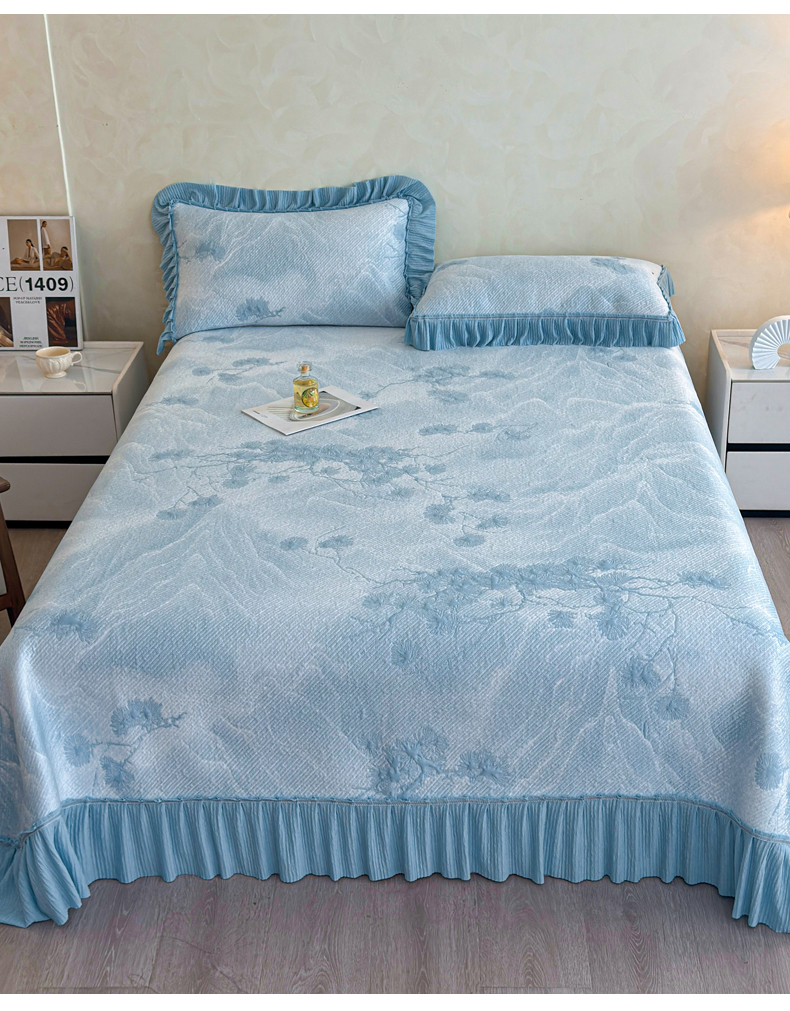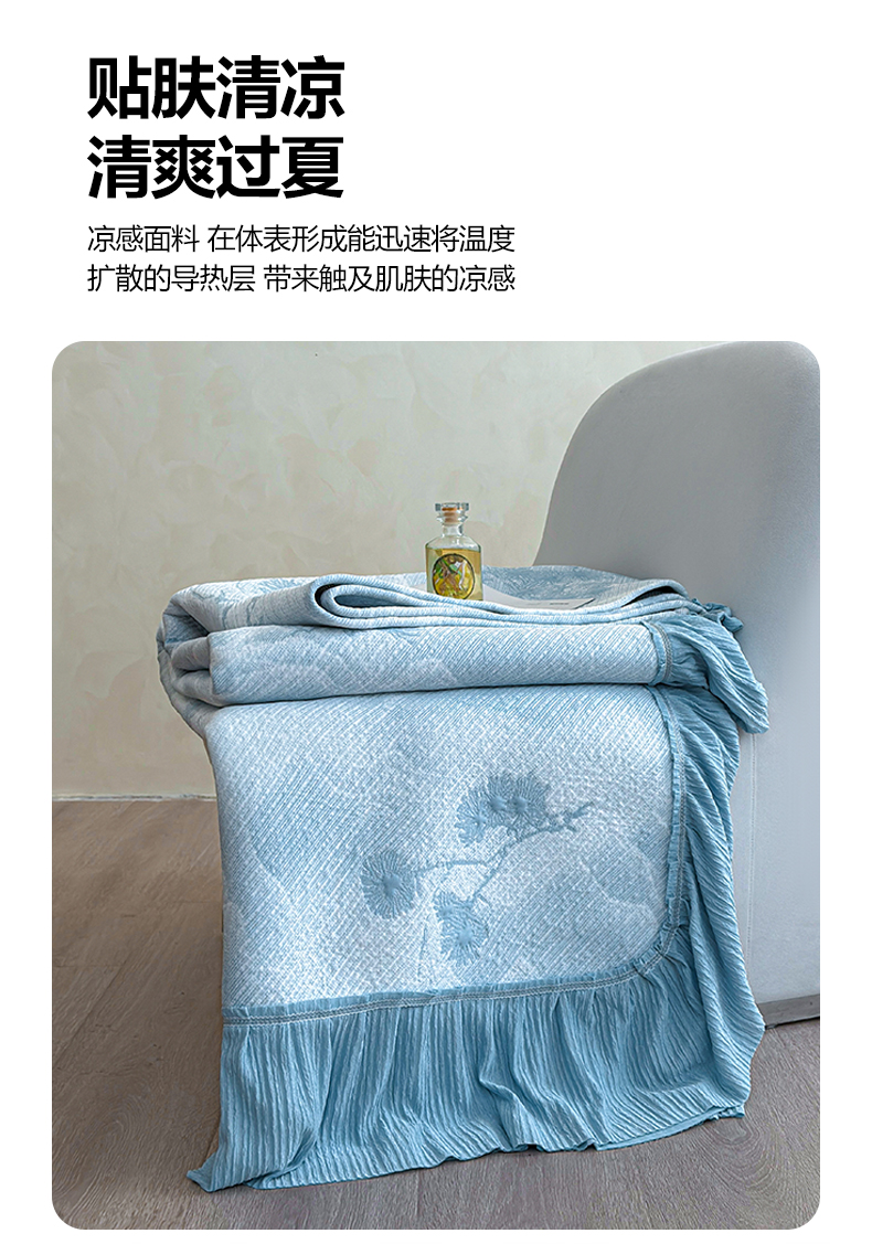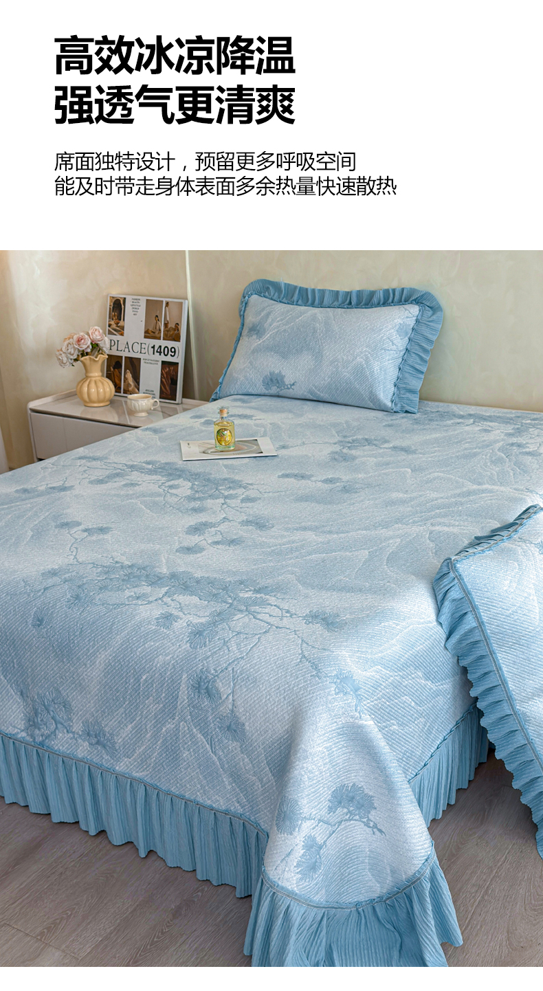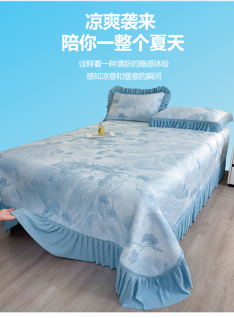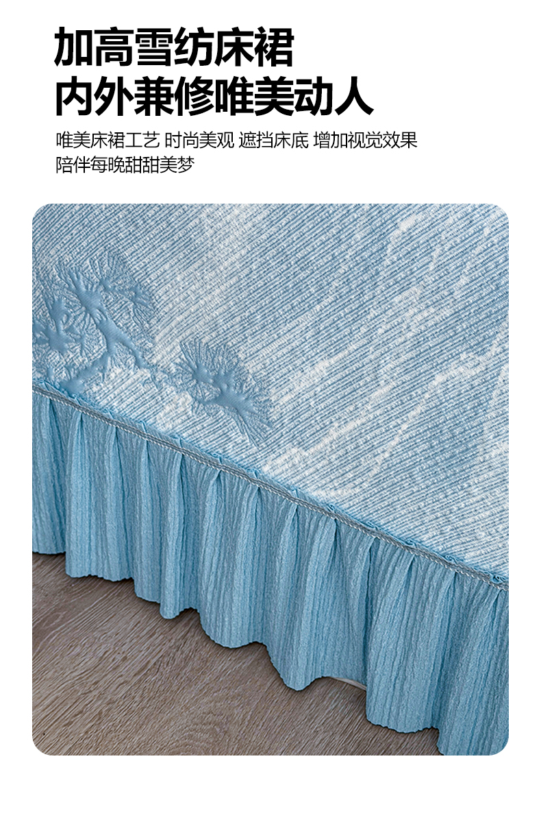 商品名称:慕木家纺 2026新款A类乙纶双面提花560克冰豆豆花边床盖款床裙迎客松系列(提供买家秀) 迎客松-蓝