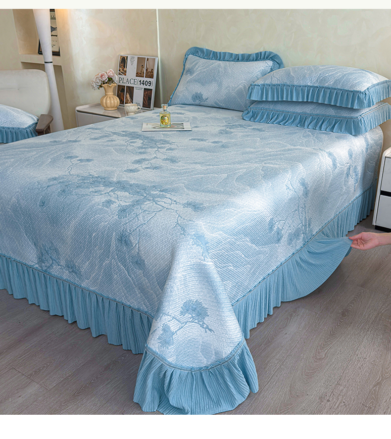 (总)慕木家纺 2026新款A类乙纶双面提花560克冰豆豆花边床盖款床裙迎客松系列(提供买家秀),迎客松-蓝,迎客松-绿,迎客松-粉,迎客松-灰