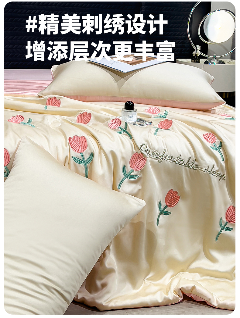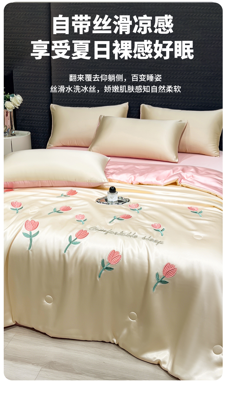 • 91家纺网 家纺一手货源 找家纺 爱彼家纺 2026夏季新款水洗冰丝轻奢刺绣凉感夏被夏凉被空调被 花朵-奶白粉