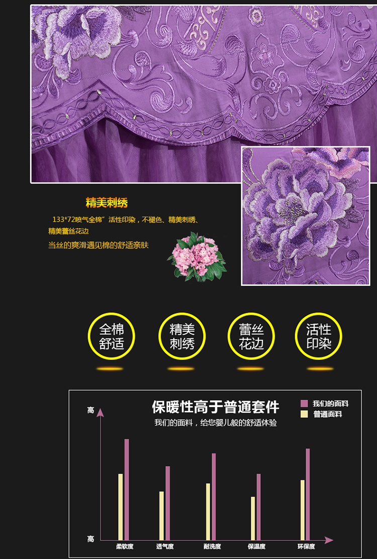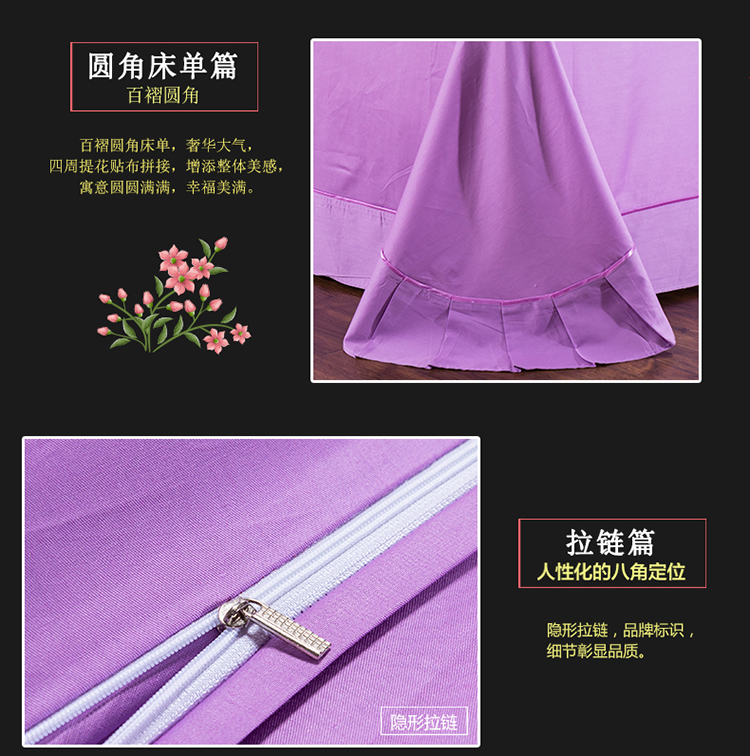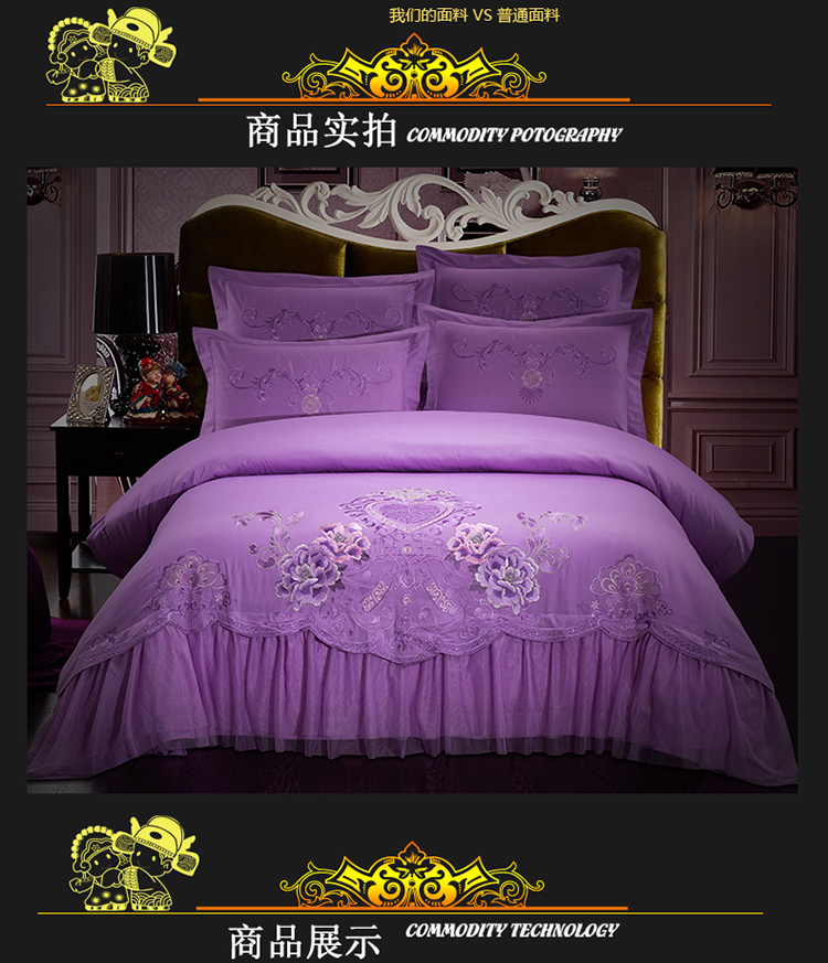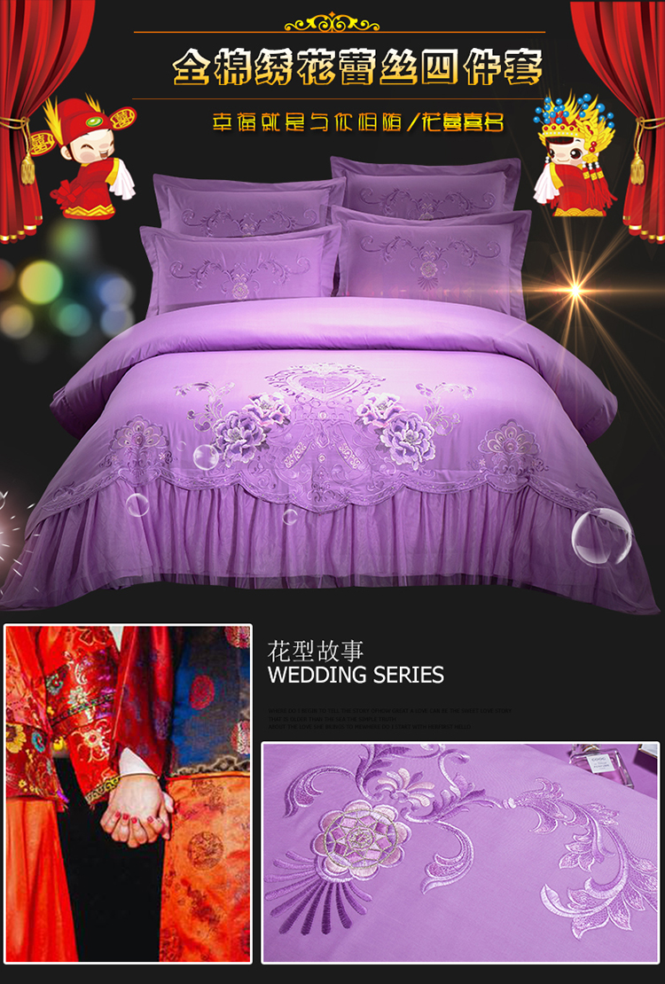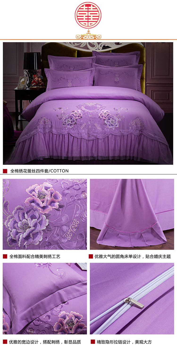 慕她家纺 婚庆四件套大红蕾丝刺绣全棉纯棉花蔓喜多雪青
